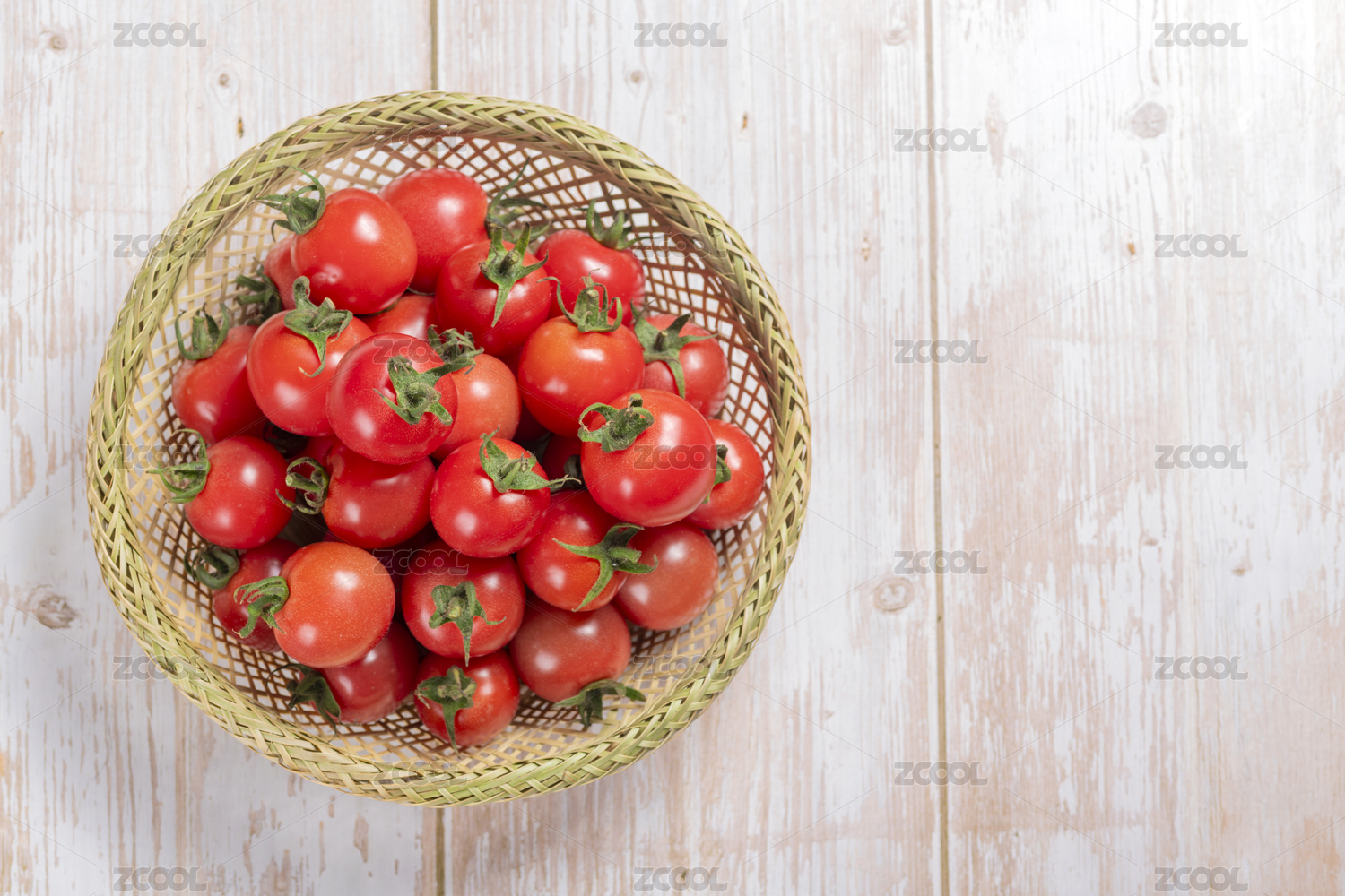 高视角拍摄桌面上竹编筐里的樱桃番茄