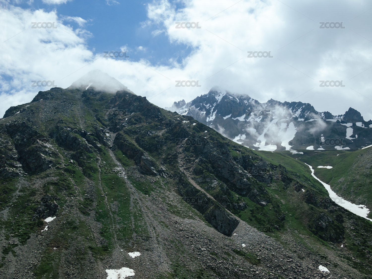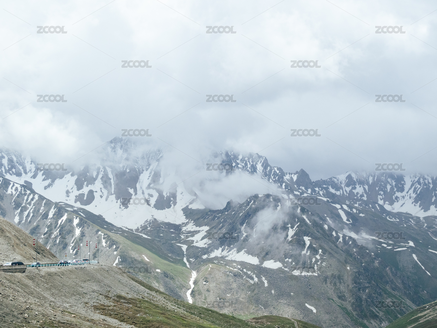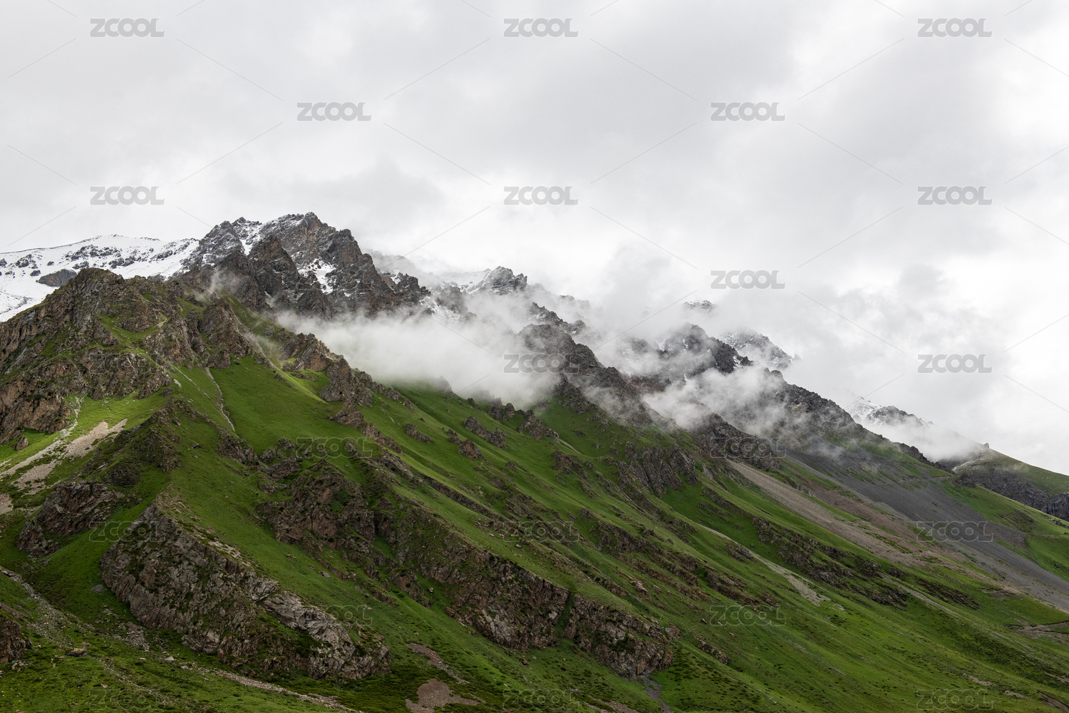 中国新疆独库公路沿线雨后云雾缭绕高山景观