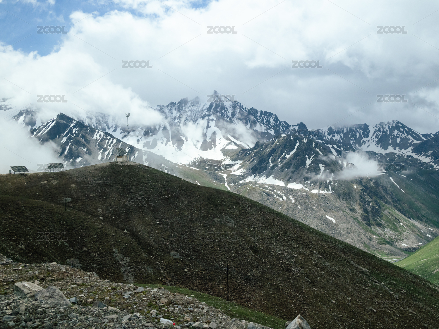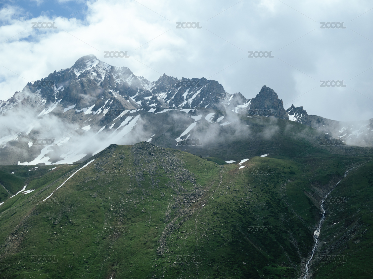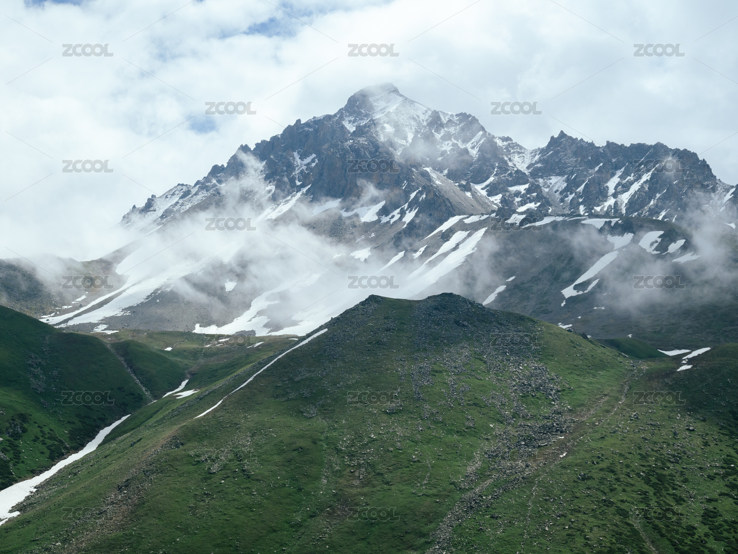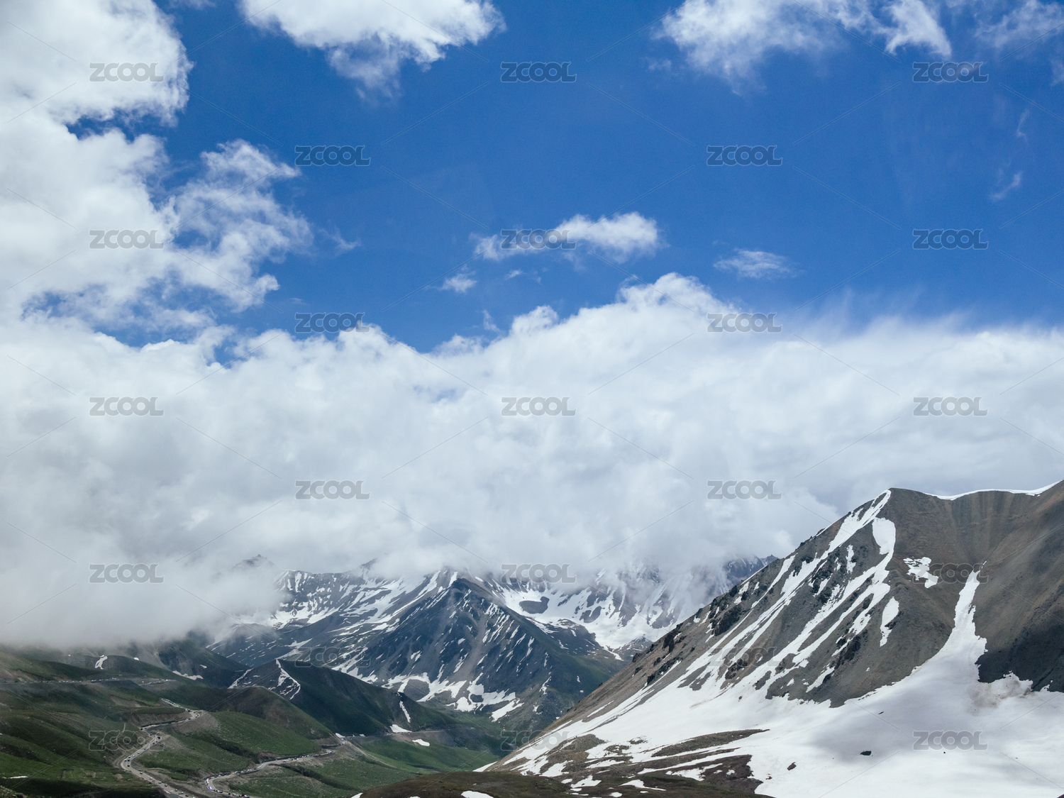 中国新疆独库公路沿线雨后云雾缭绕高山景观