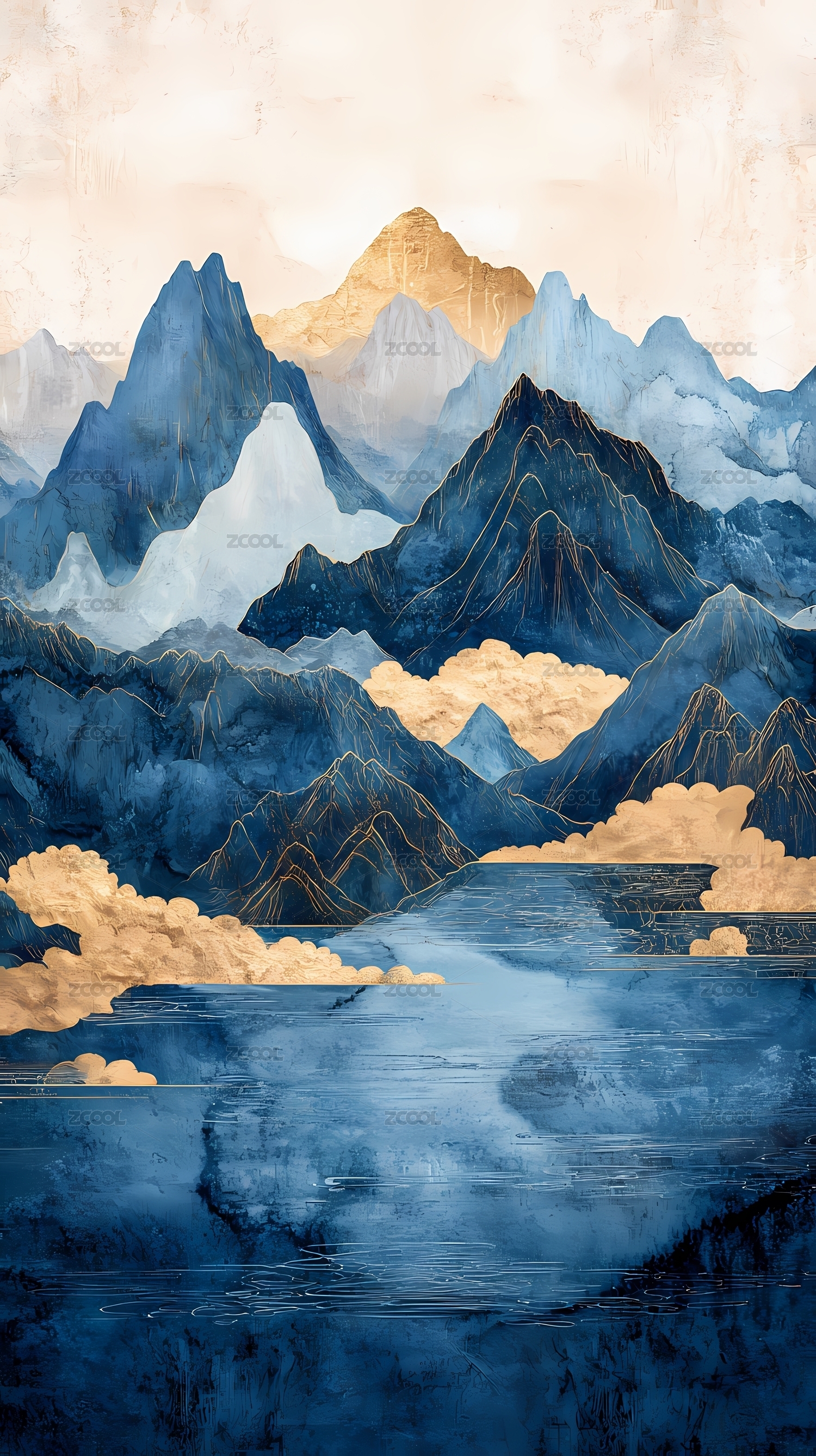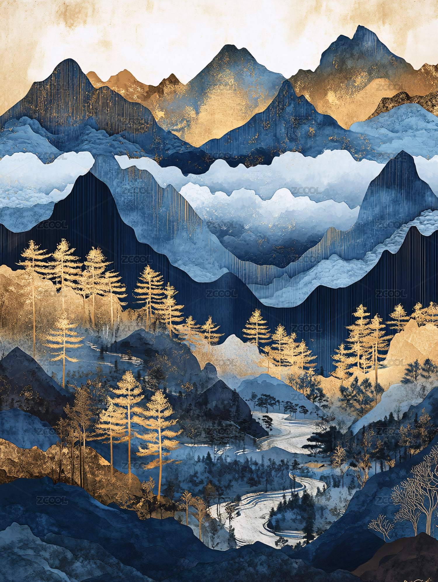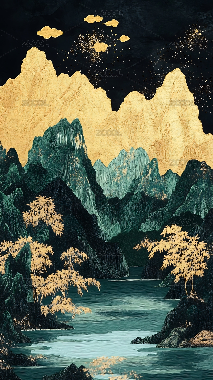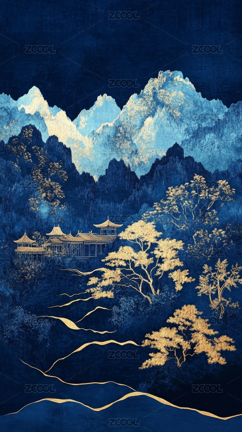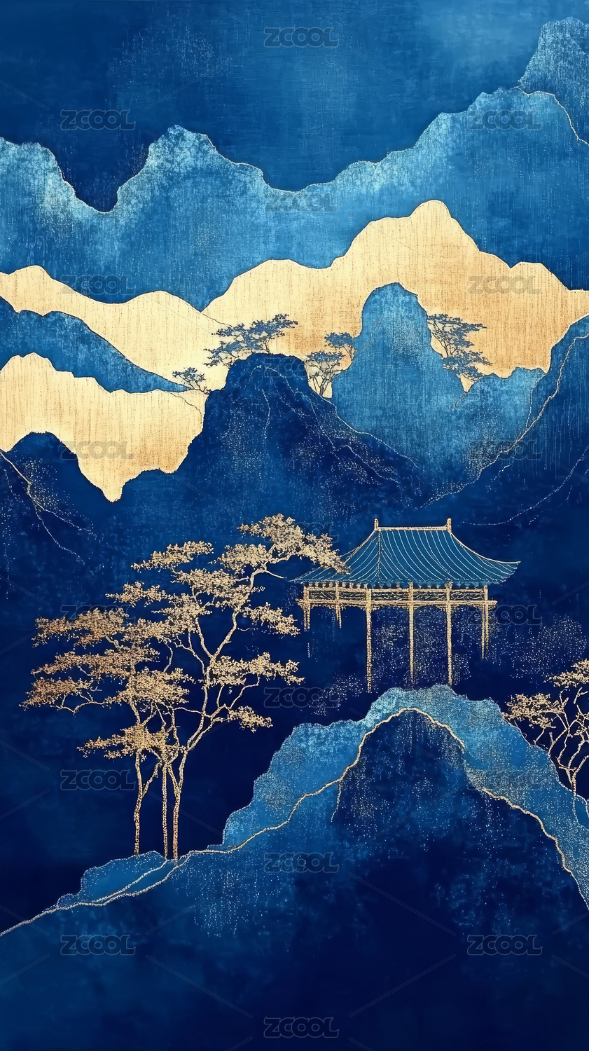 亭台,楼阁,水墨画,青蓝,金色,山峰,树木,山水画,传统,艺术