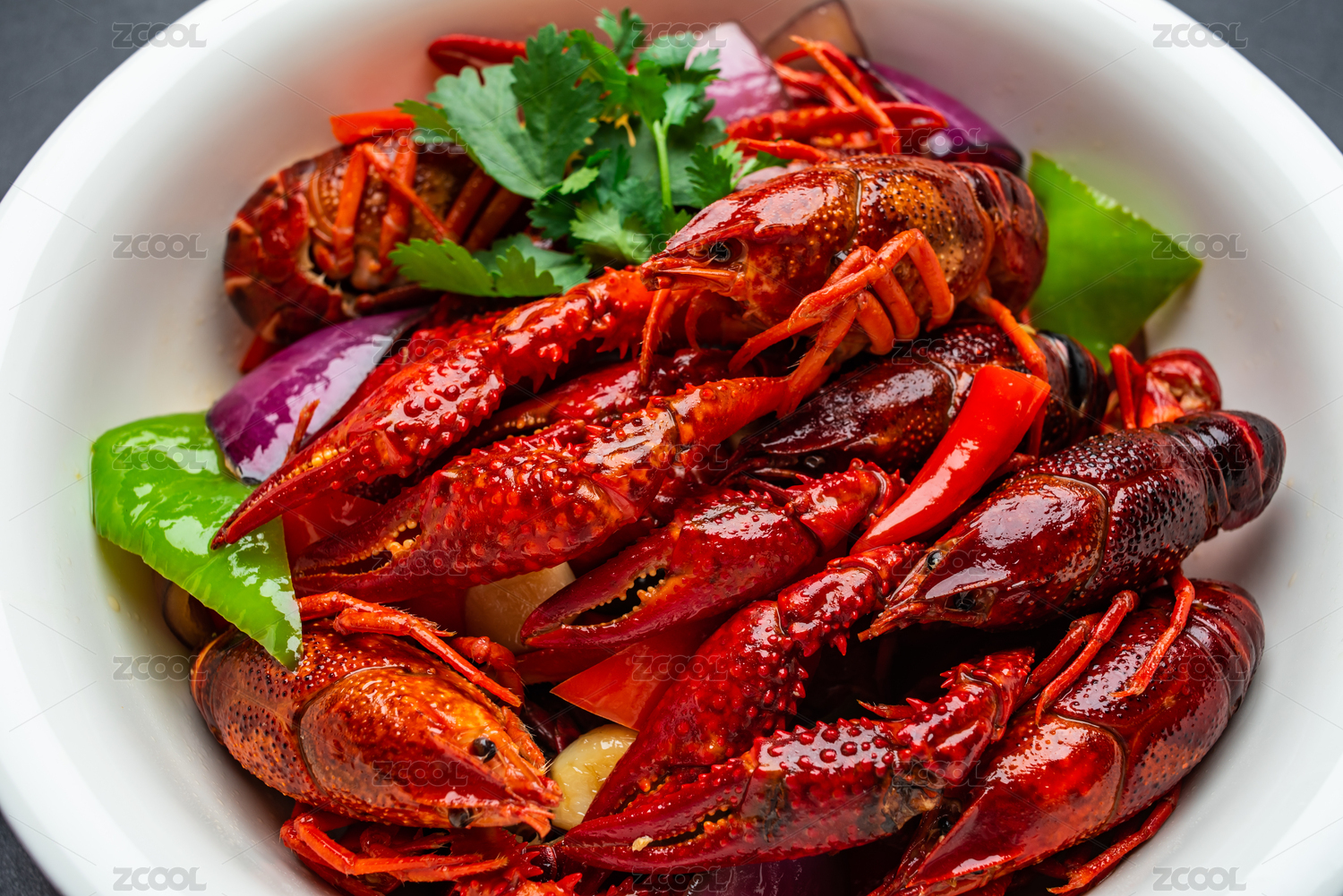 一盆鲜红美味香辣小龙虾特写