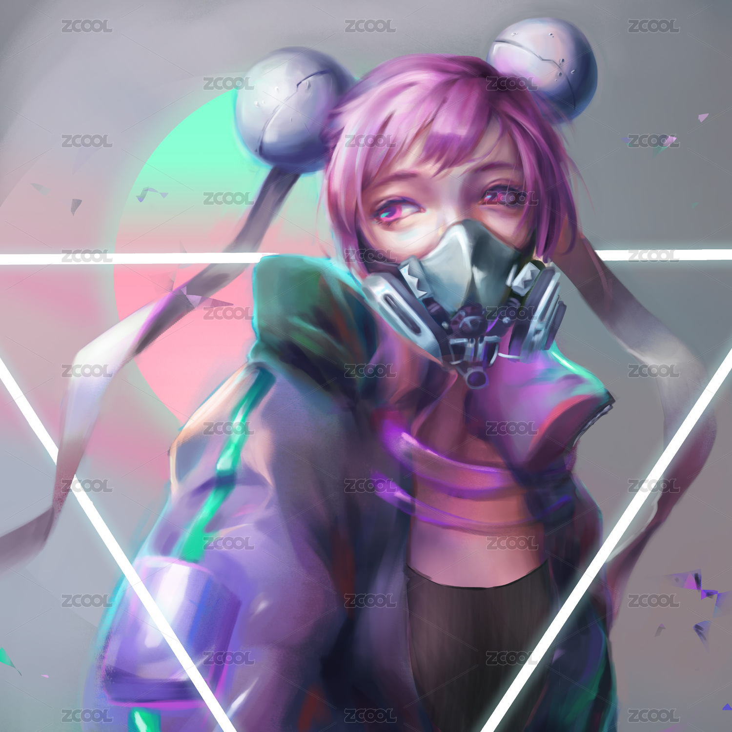 粉色短发红色眼睛机械科幻手绘美少女插画