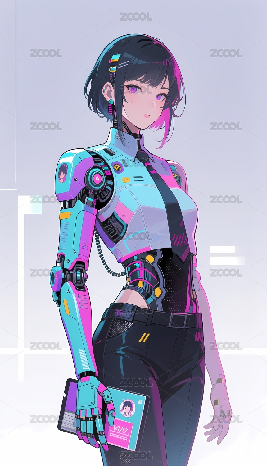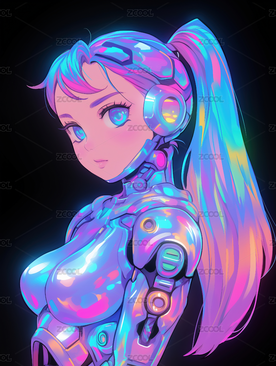 赛博朋克风格人物 炫彩长马尾机械少女
