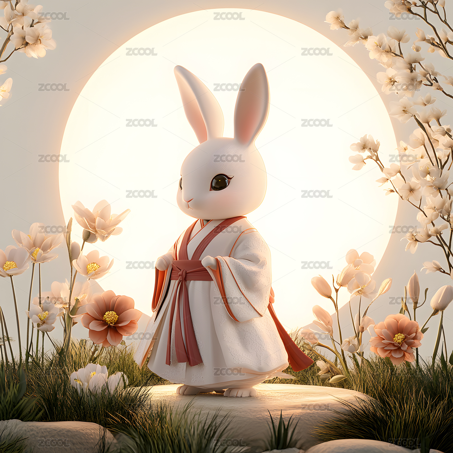 兔子,月兔,樱花,亮月,圆月,和服,花瓣,花枝,呆萌,娇柔