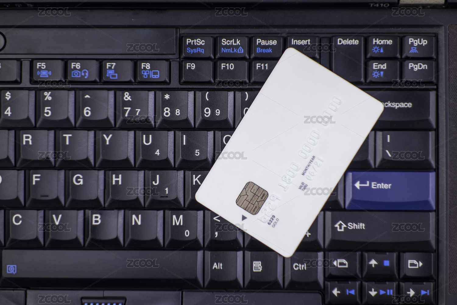 叠放在一起的信用卡放在笔记本电脑键盘上