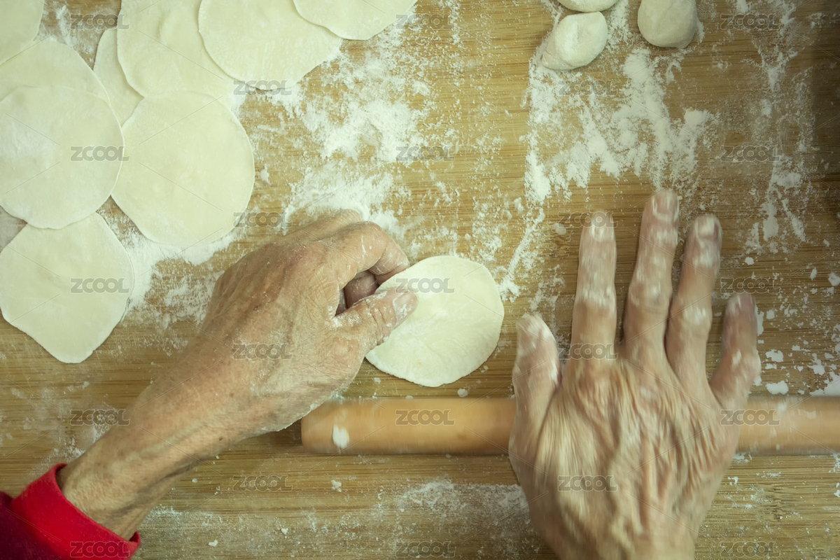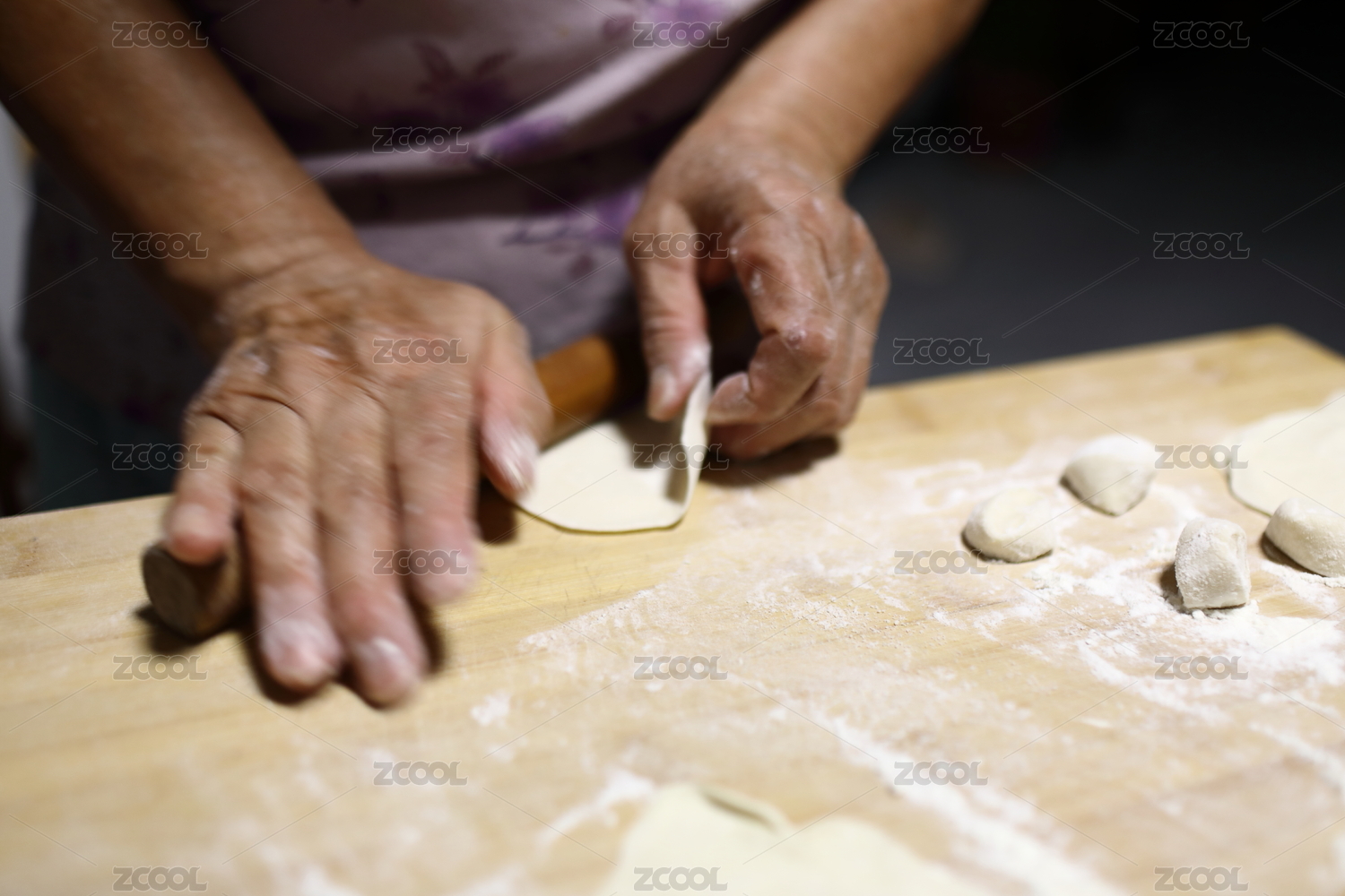 中国家庭主妇正在砧板上擀饺子皮准备包饺子