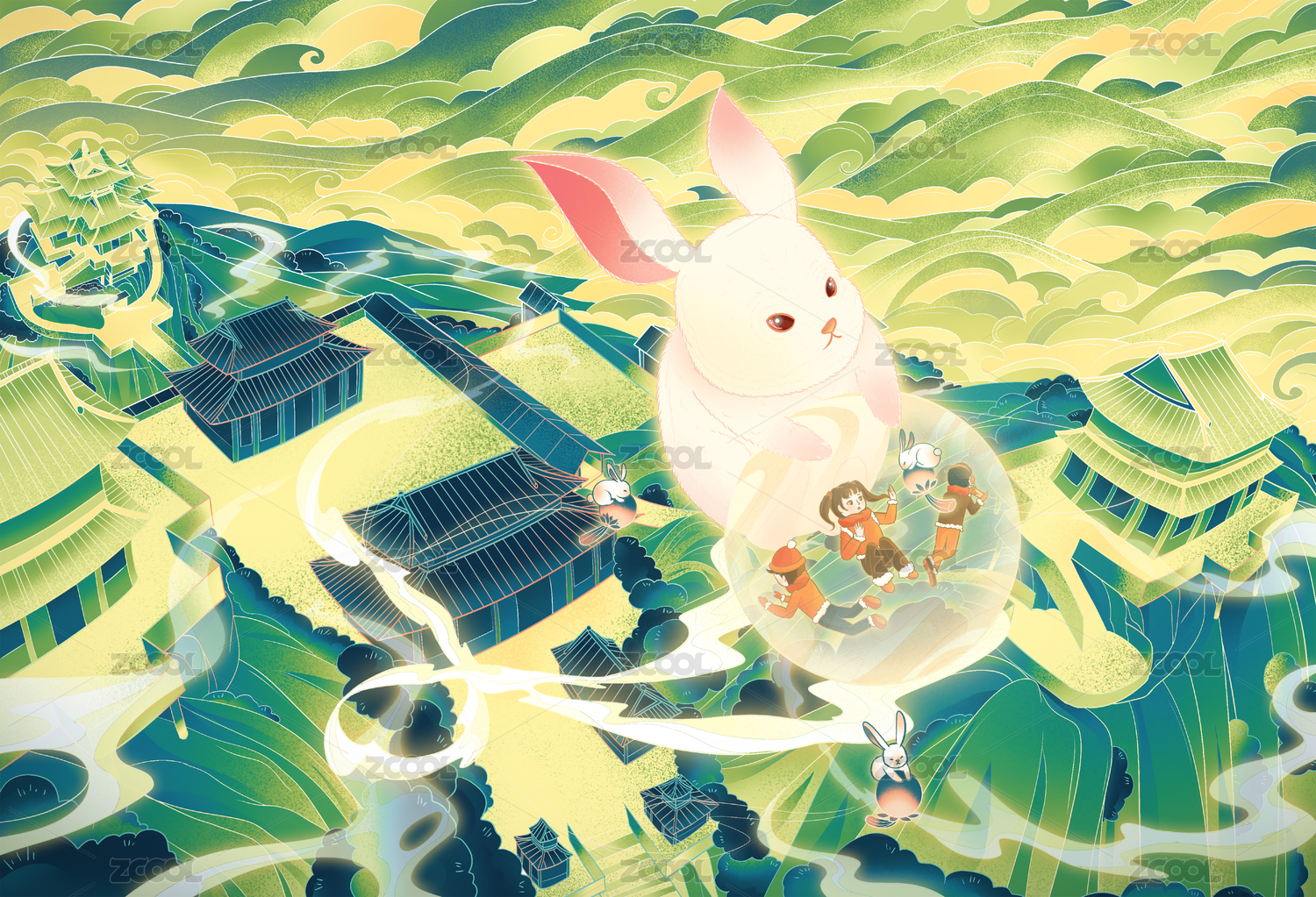 手绘卡通兔年夏季洛阳老君山国潮插画