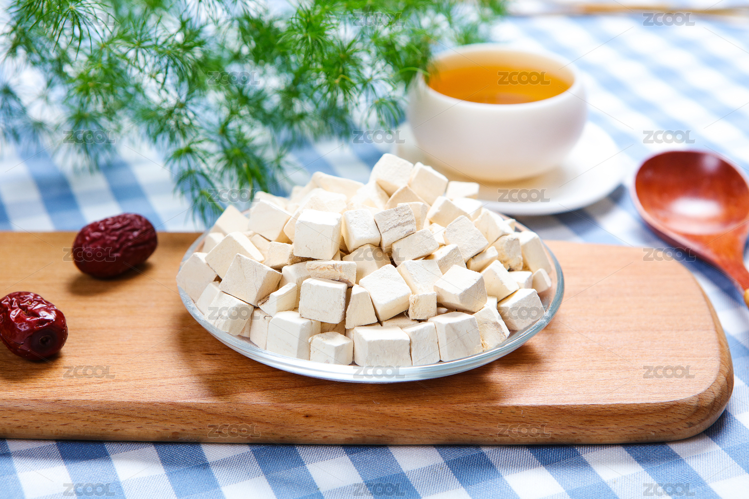 中式复古场景中装在木盘中的茯苓块