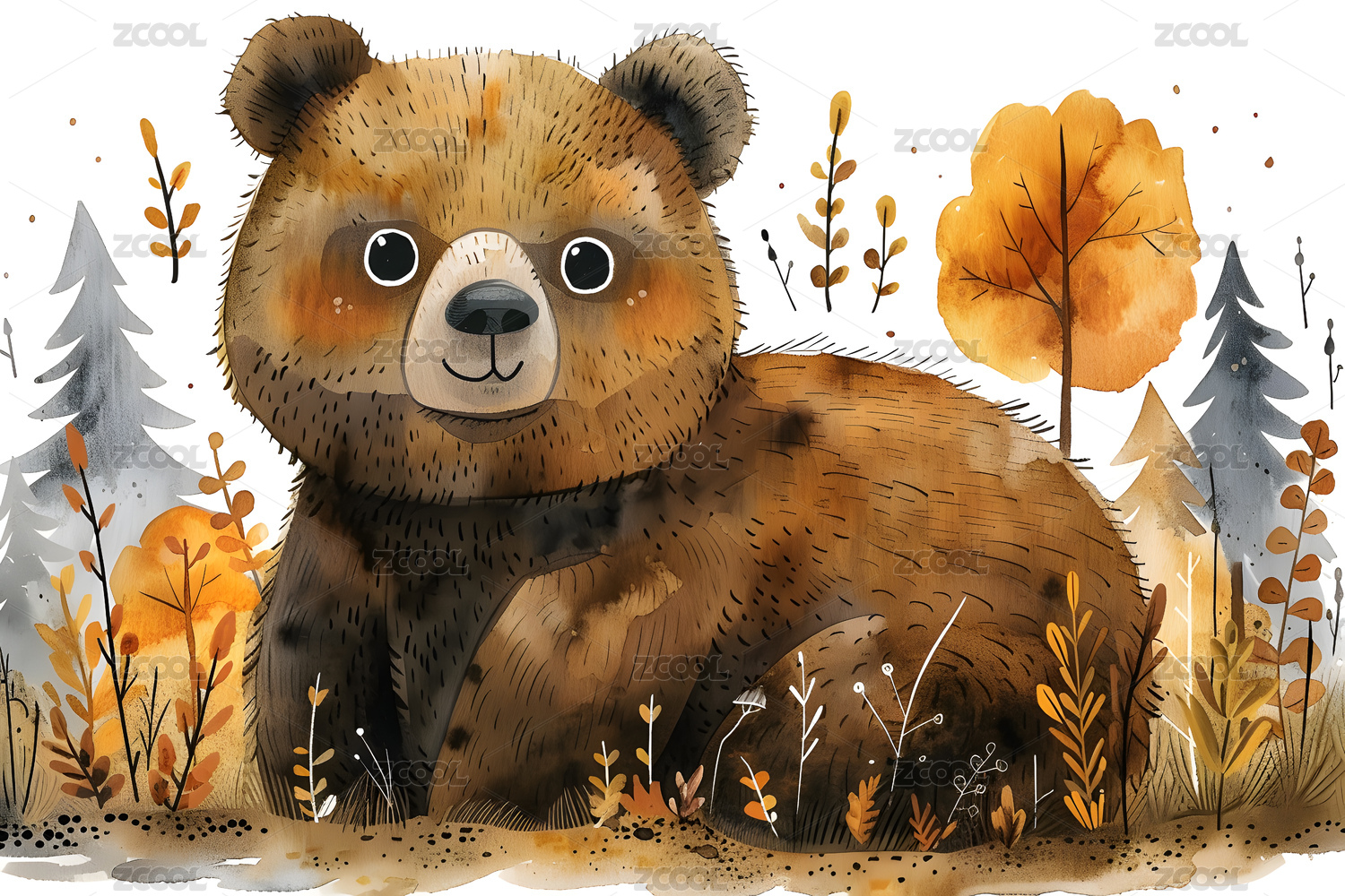 水彩插画森林里的小棕熊