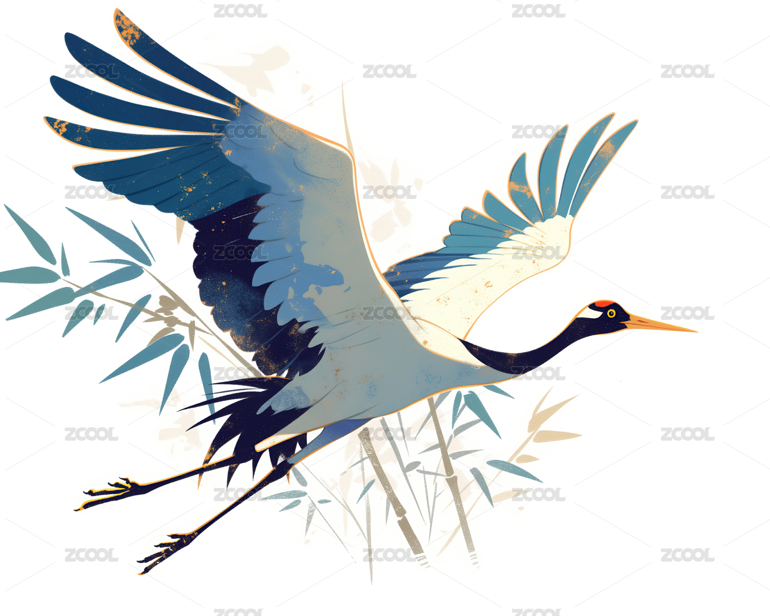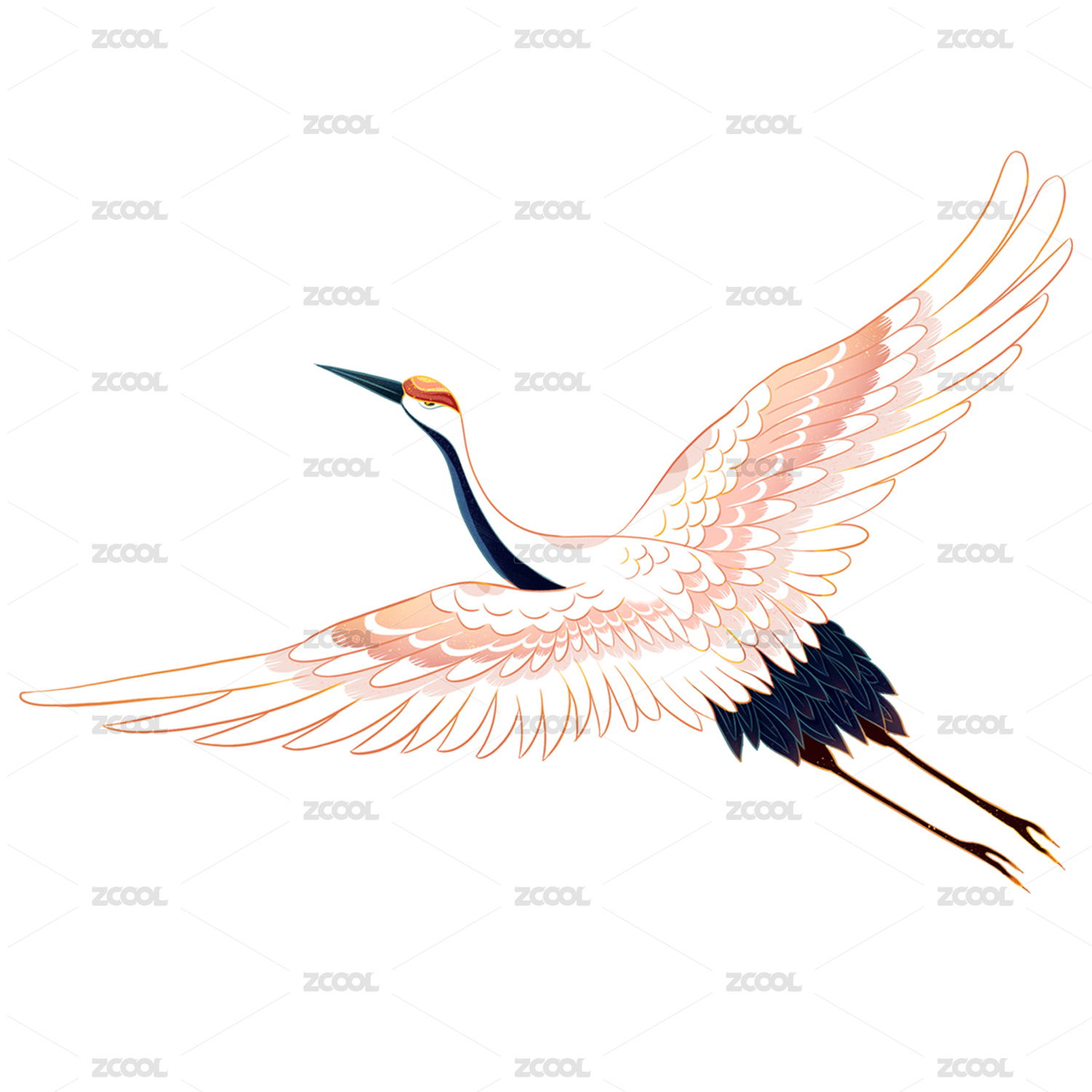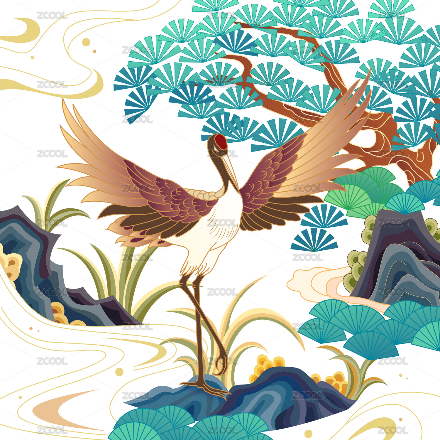 站立,石头,仙鹤,动物,展翅,元素,插画,传统,艺术,风格