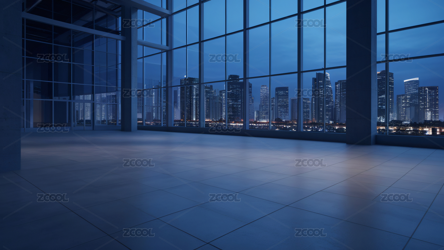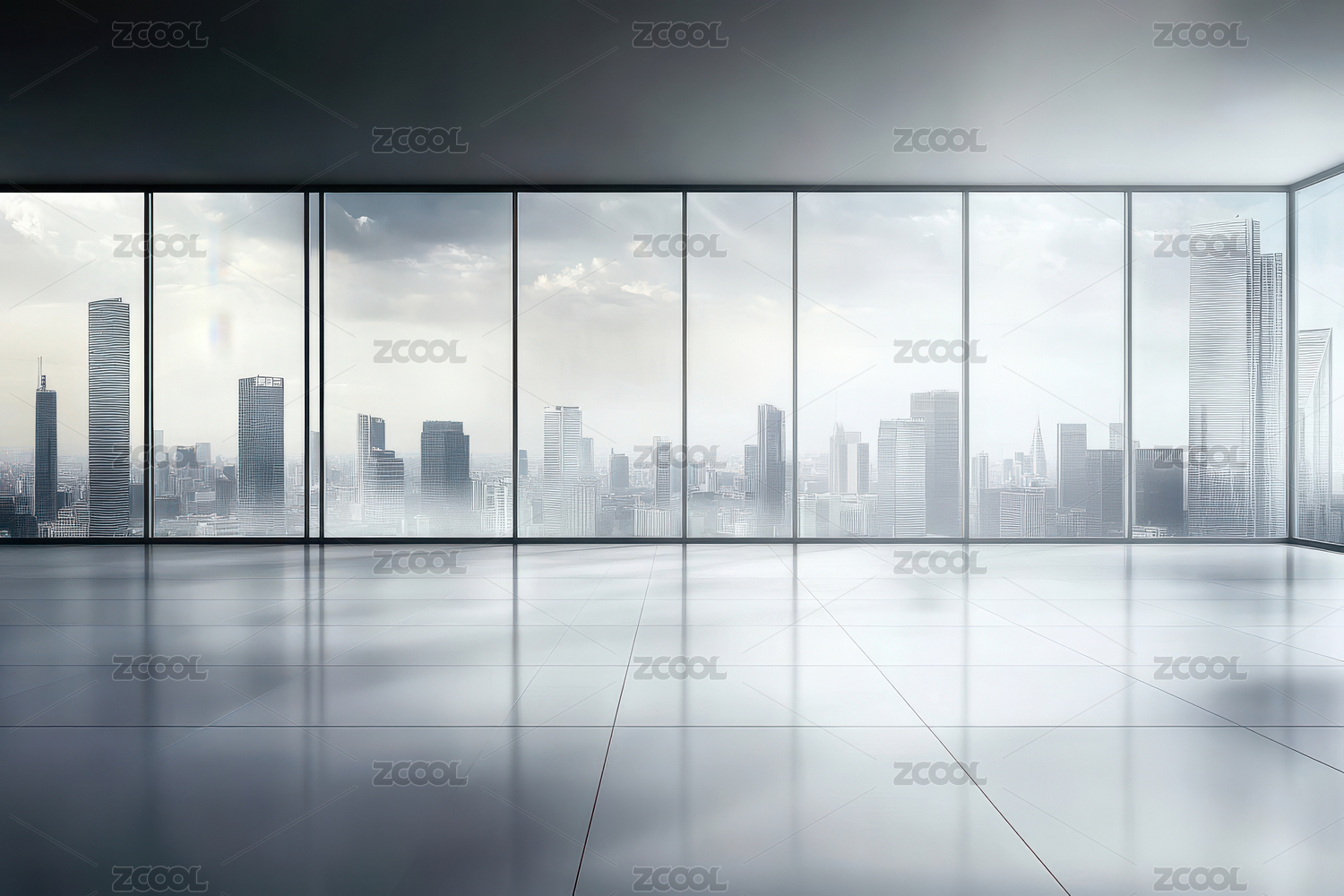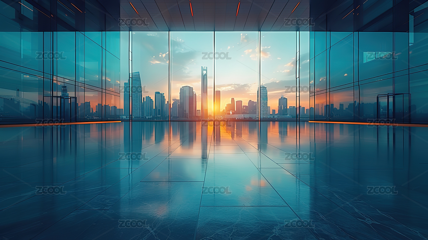 现代商务办公大楼玻璃幕墙室内空间
