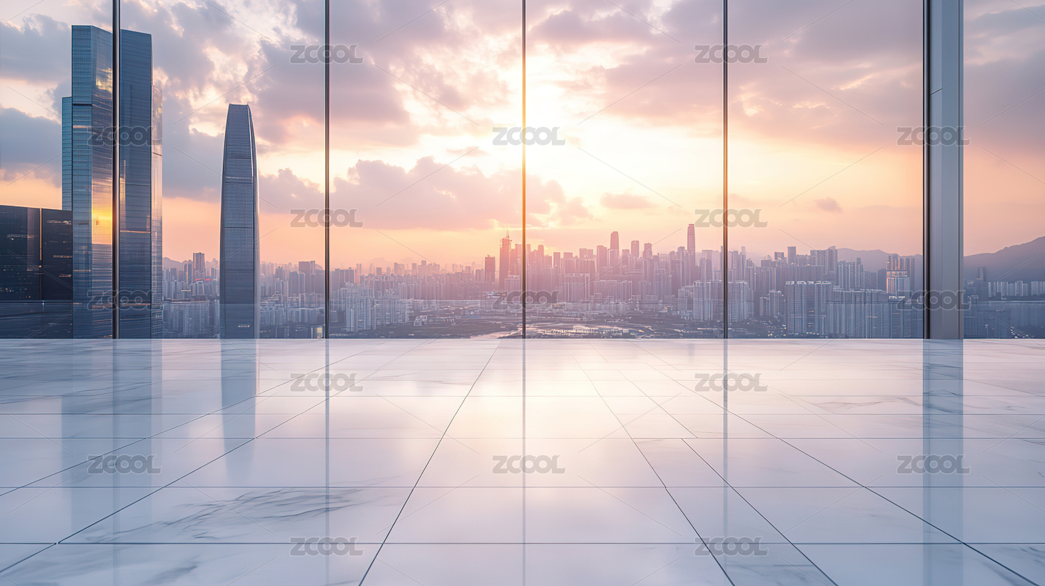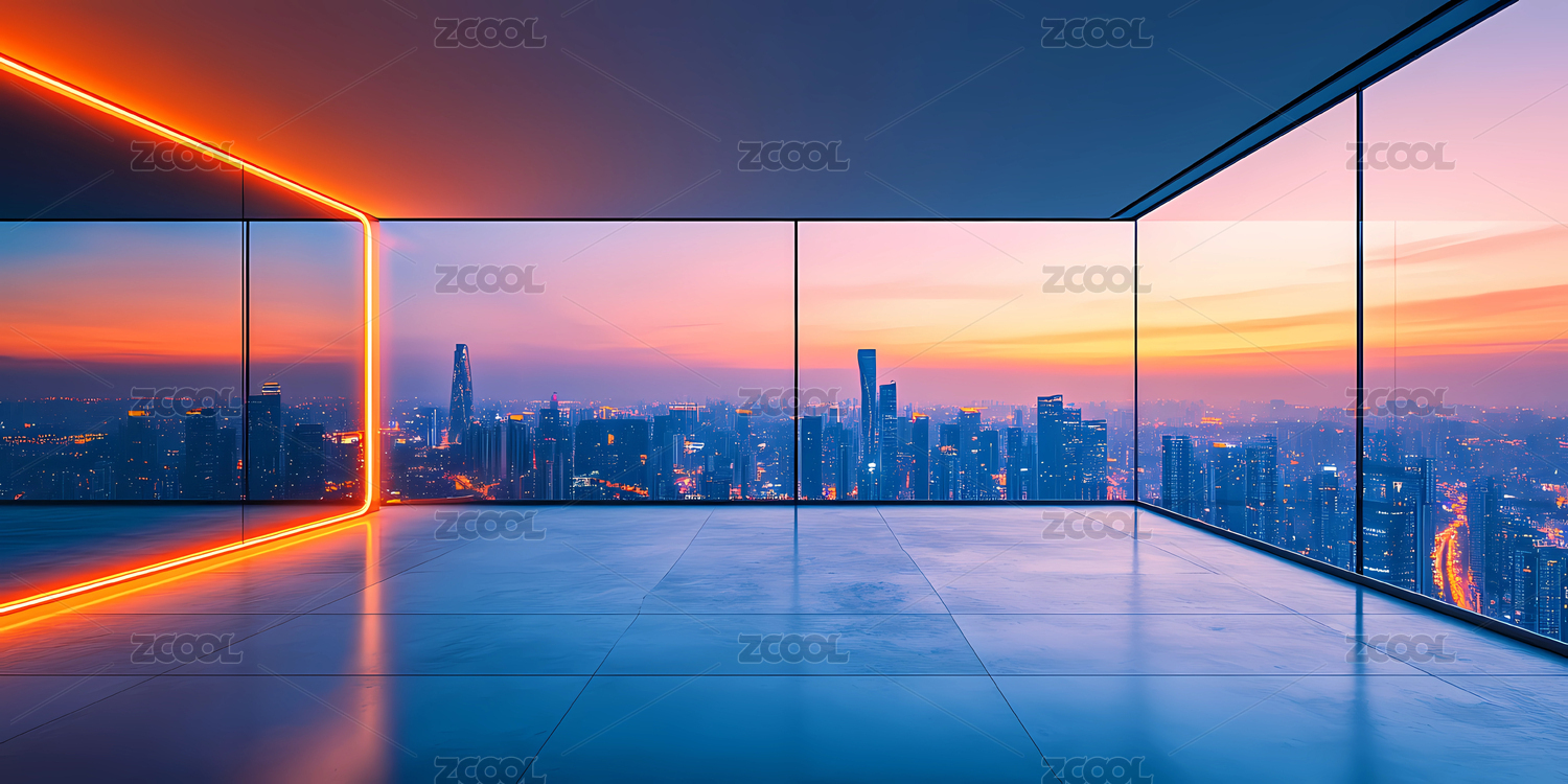 简约办公楼商务空间俯瞰日落时分的城市