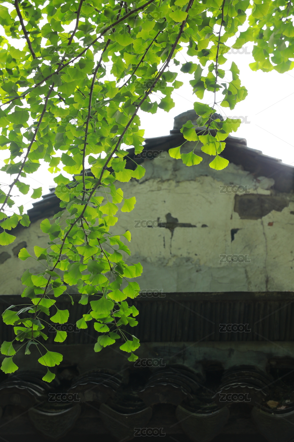 初夏公园古建筑阳光下屋顶瓦缝间的植物