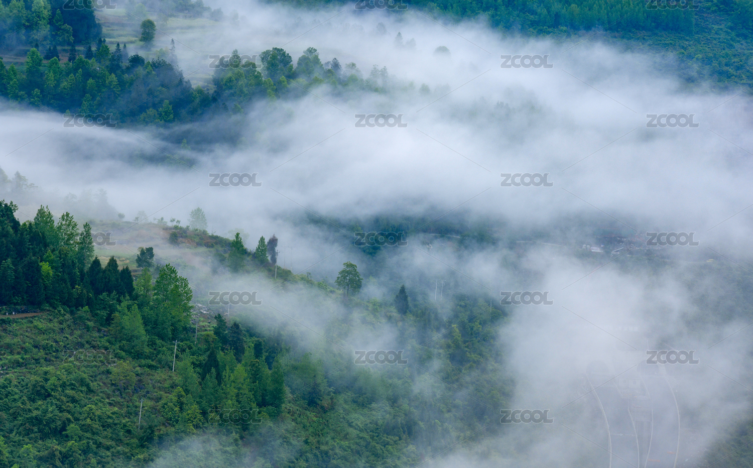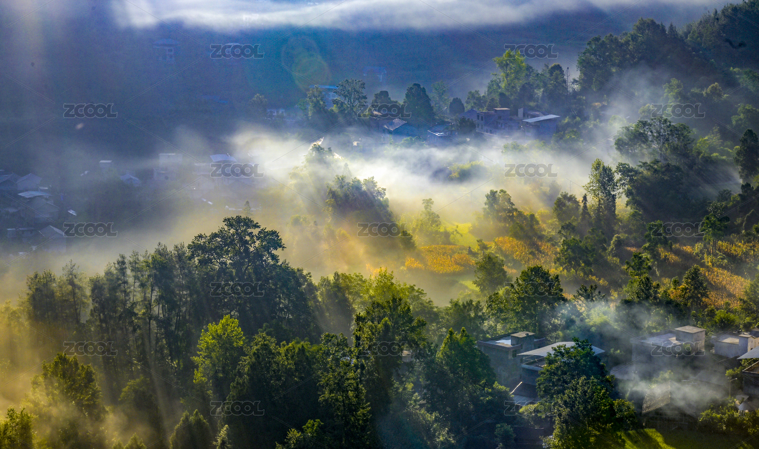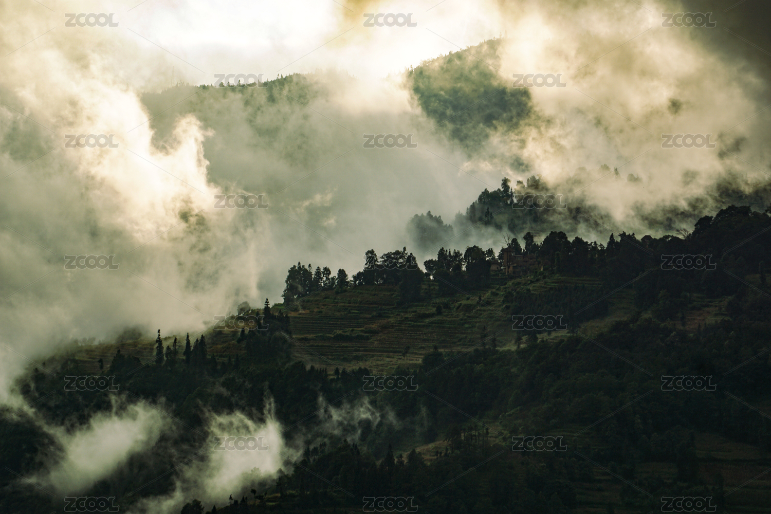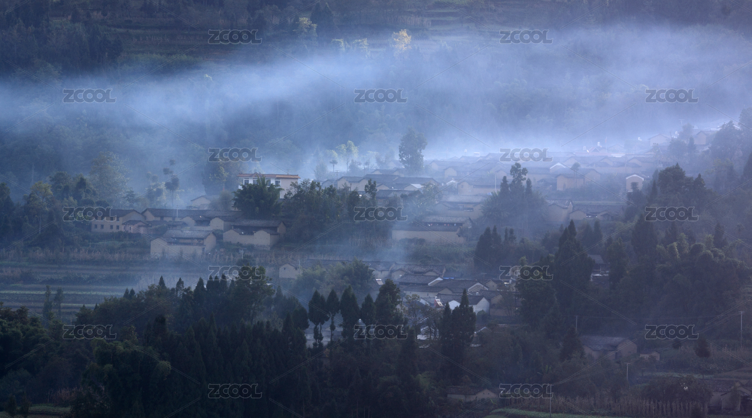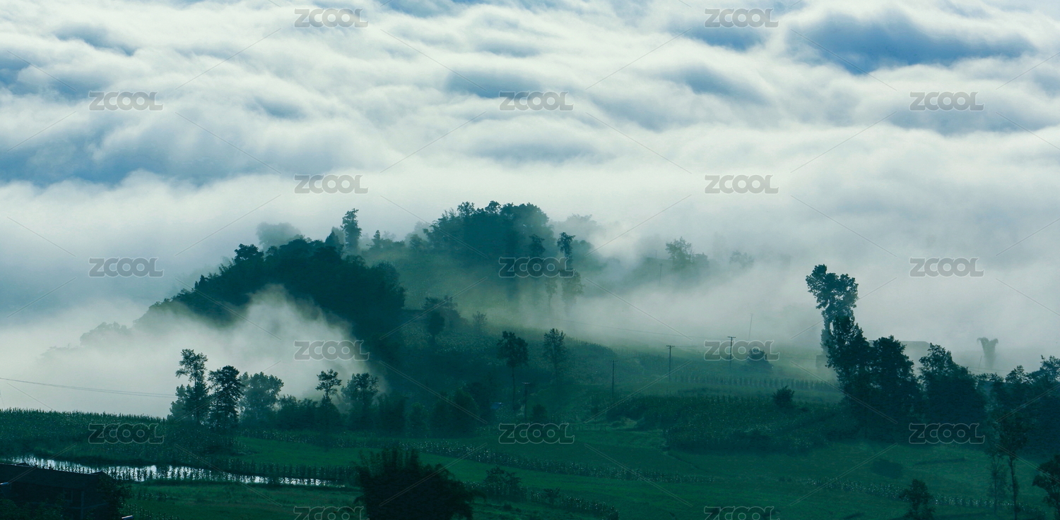 中国四川省农村山区清晨雾气弥漫