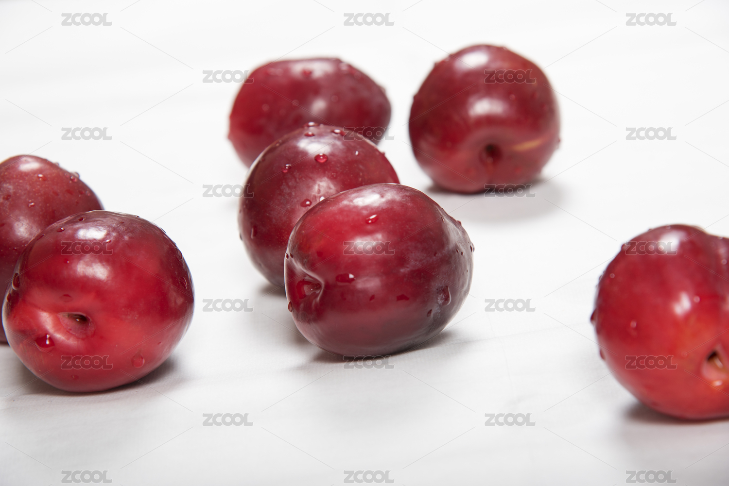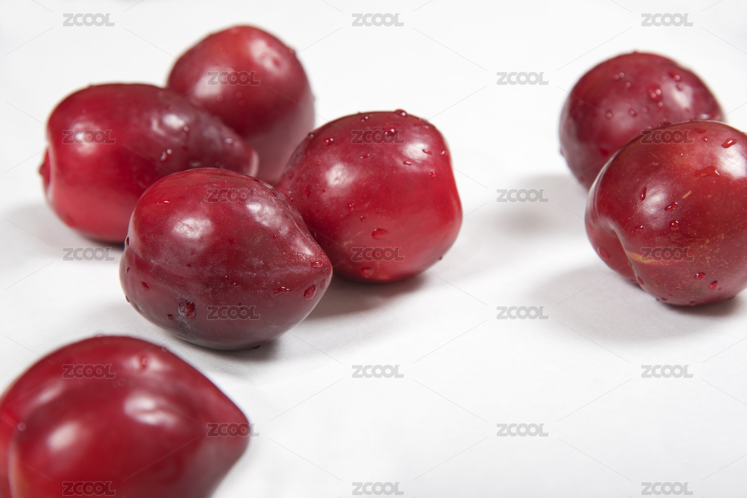白色背景上随意摆放的红色李子水果