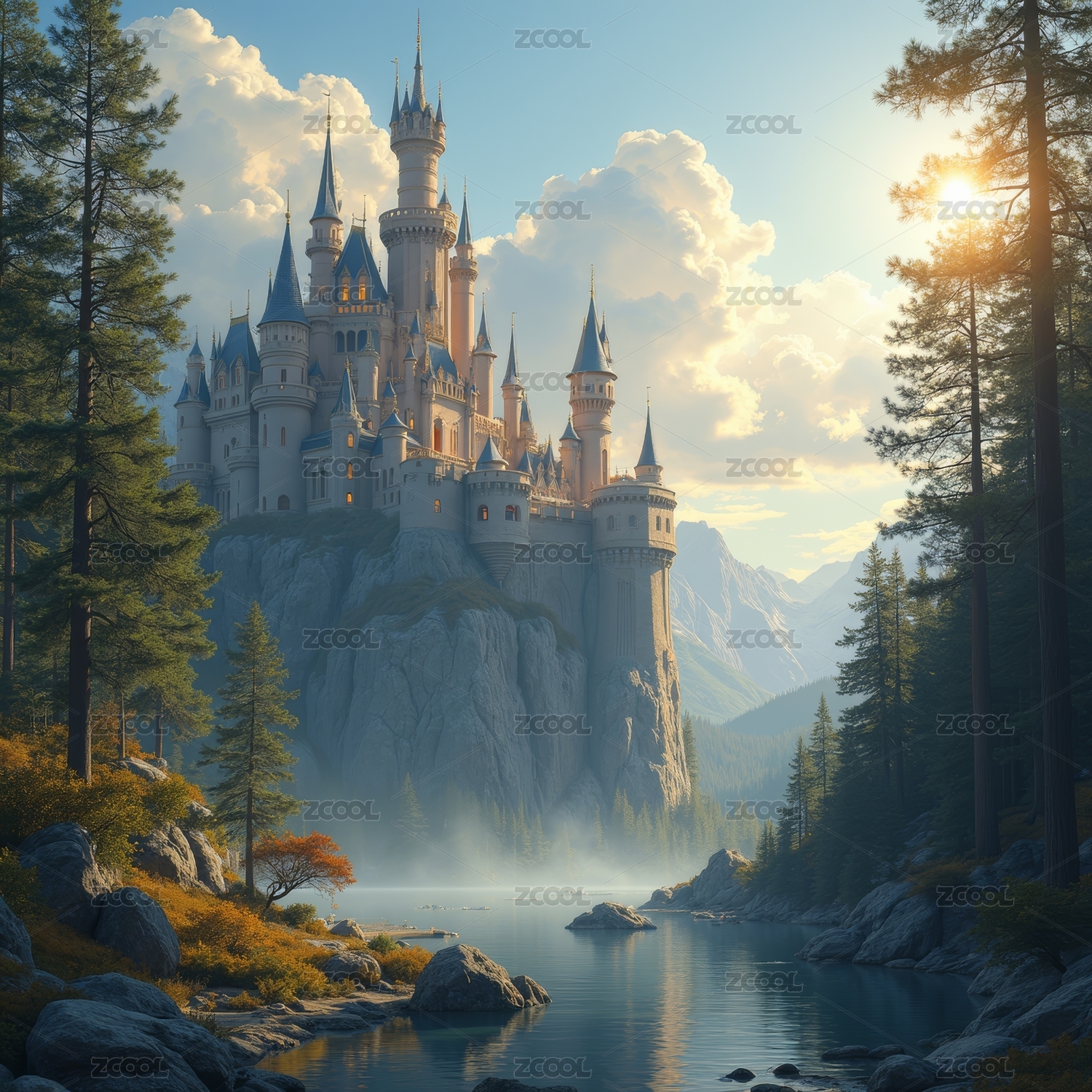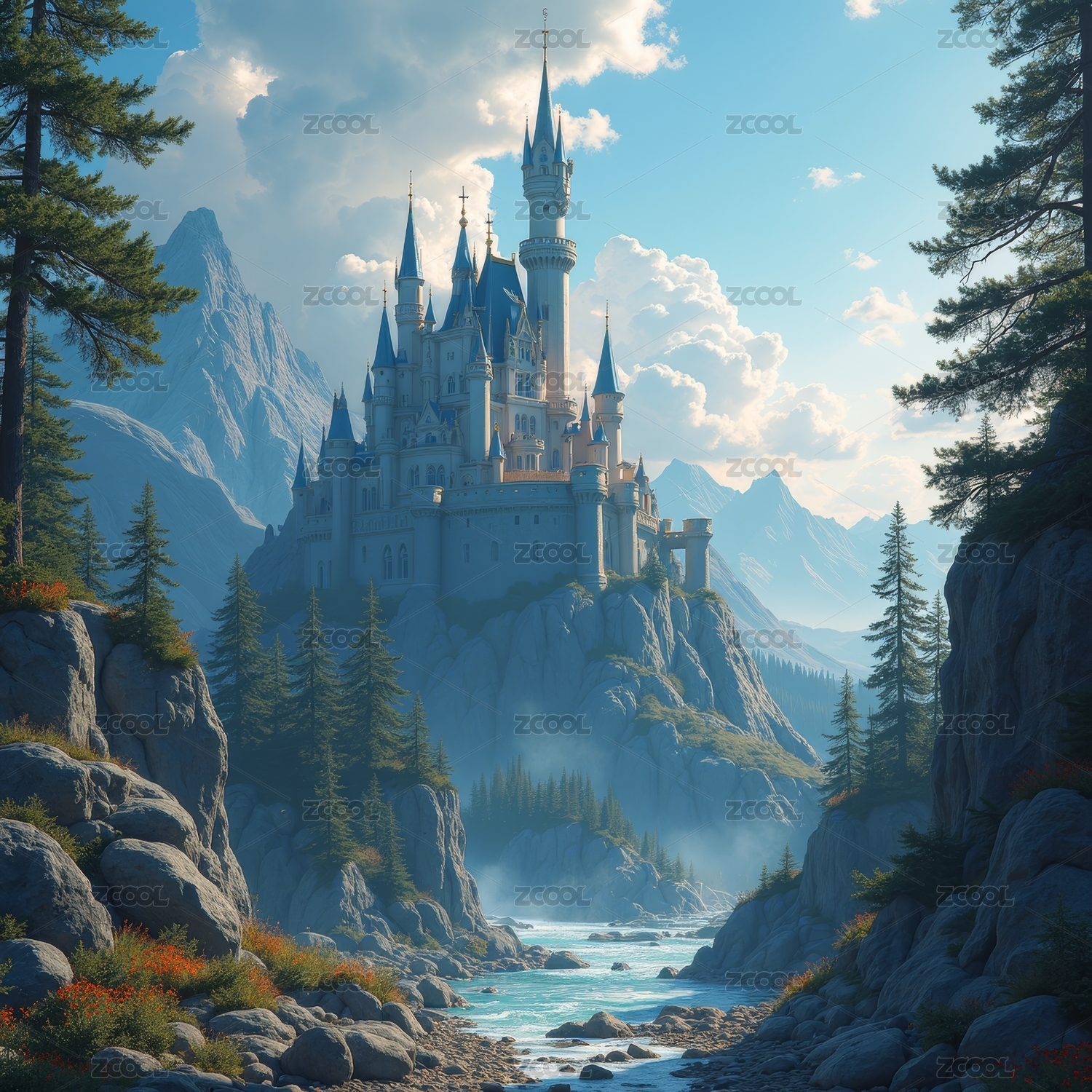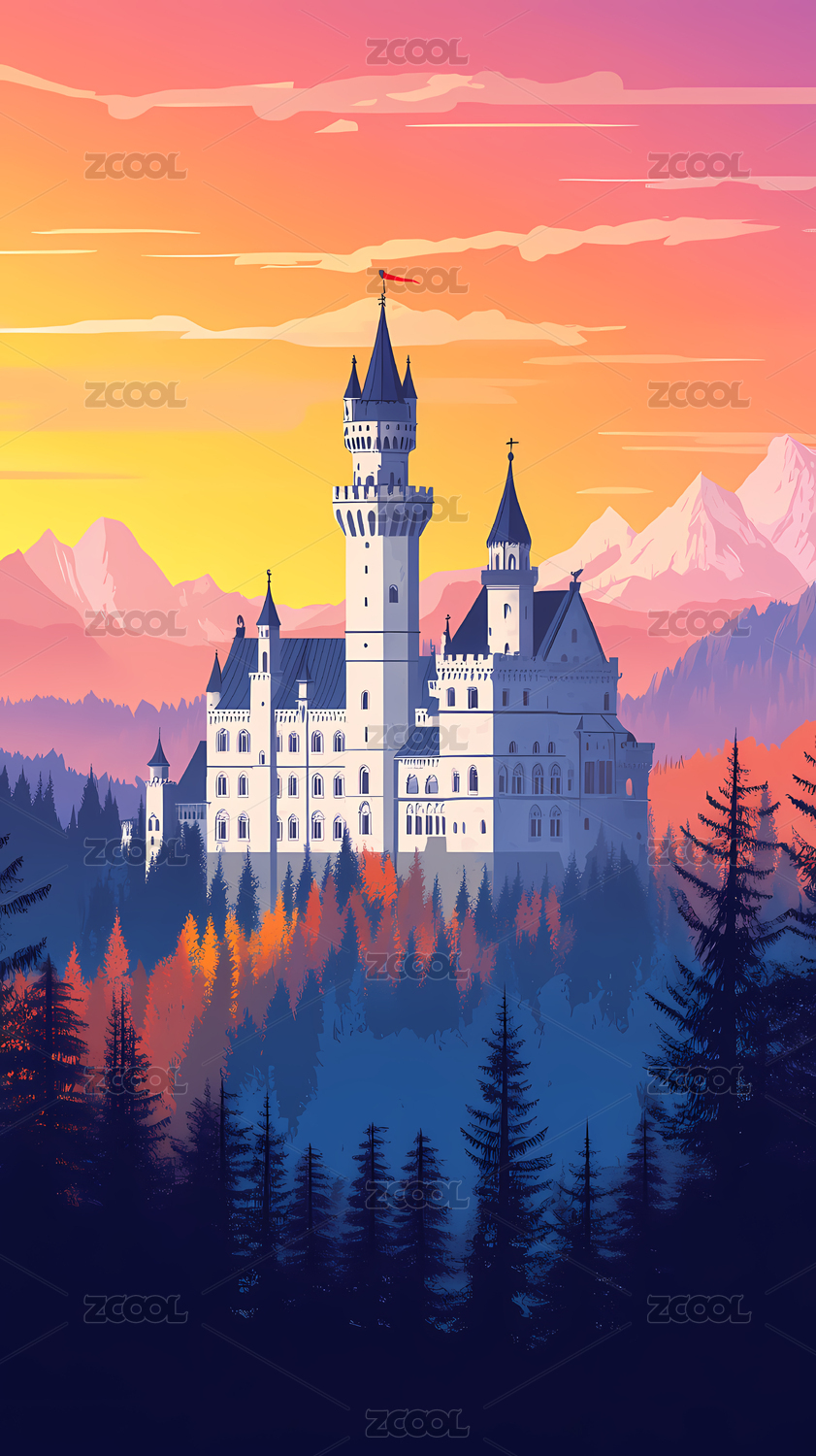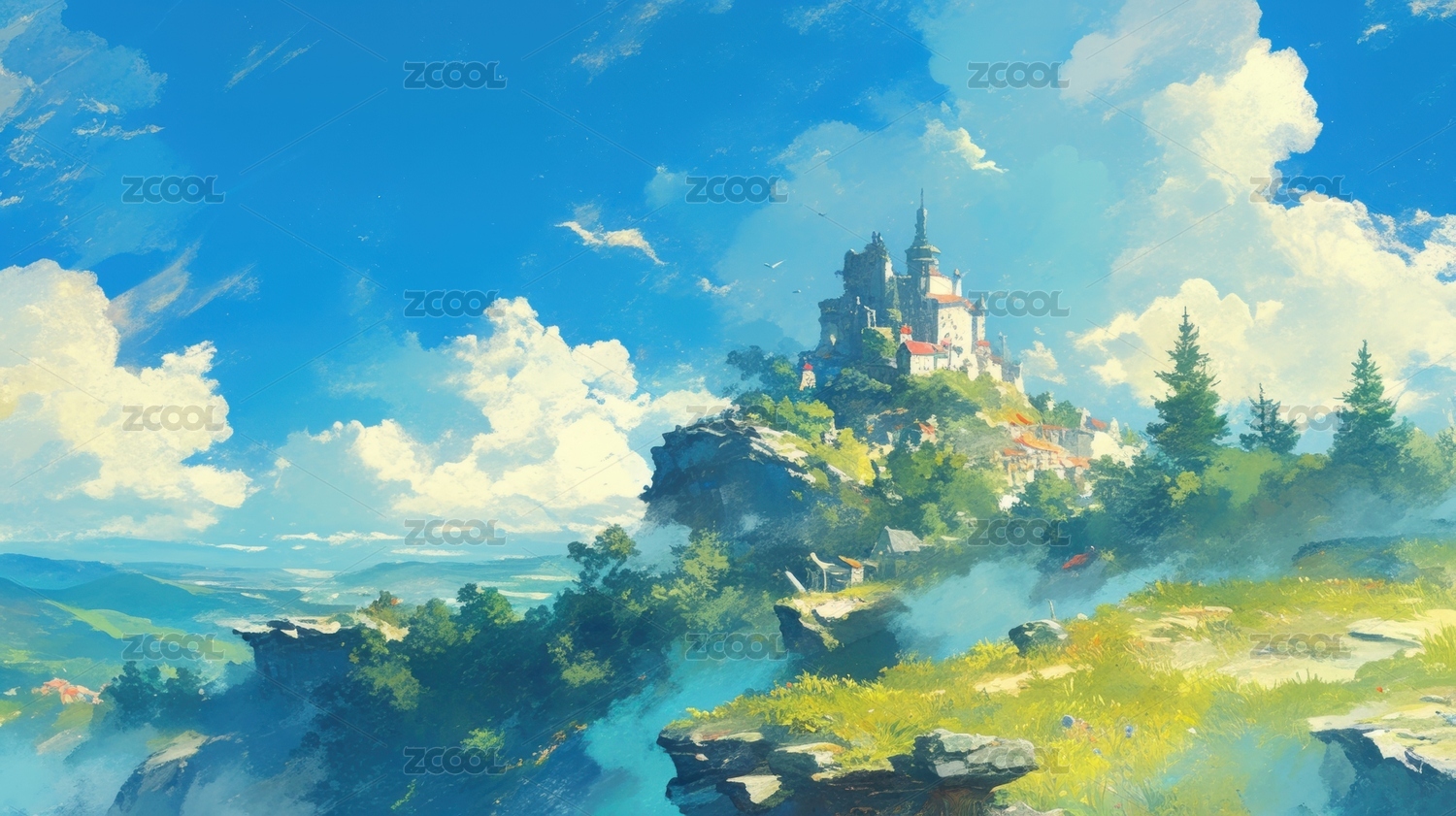 奇幻田野远方的山顶欧式古典尖顶城堡插画