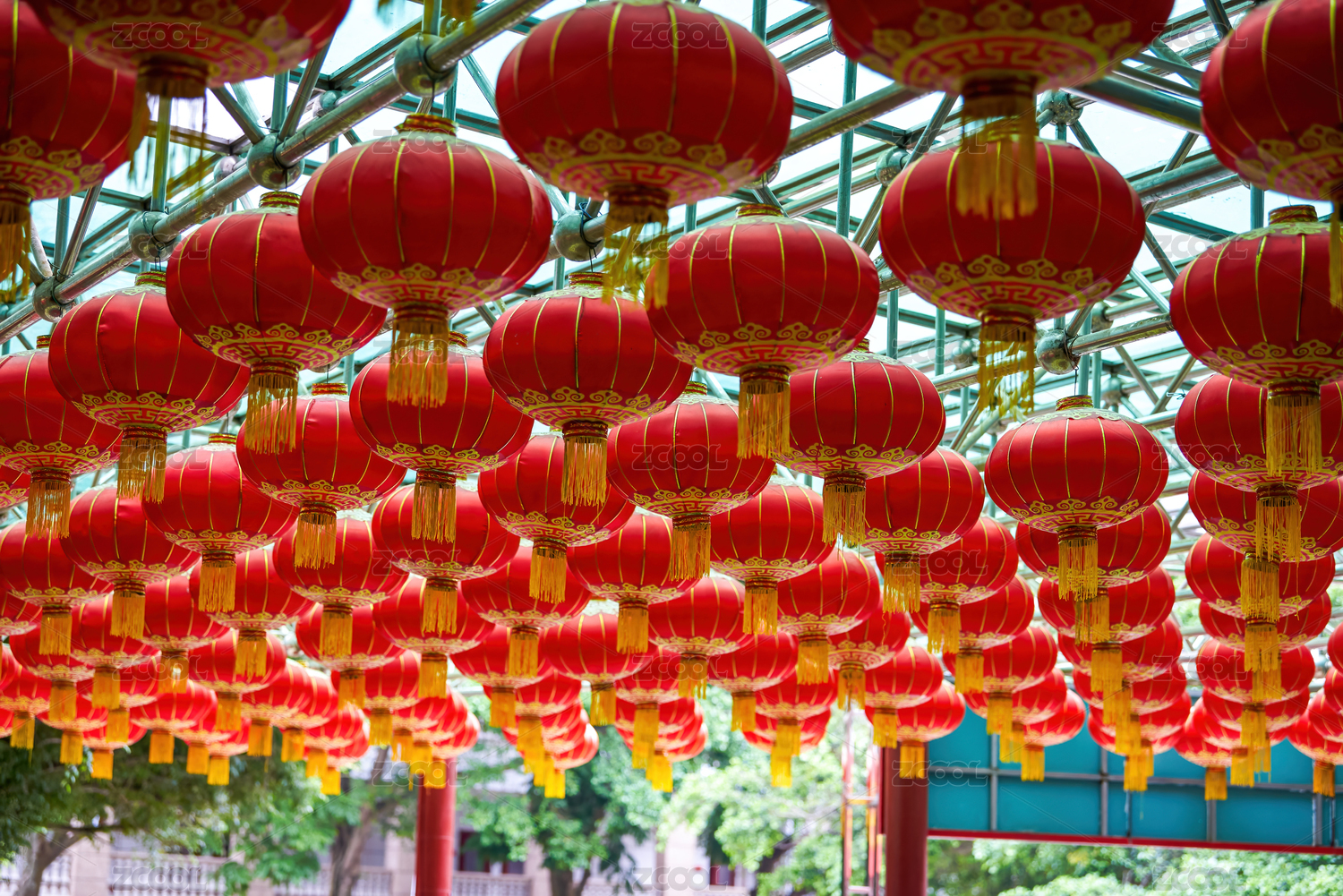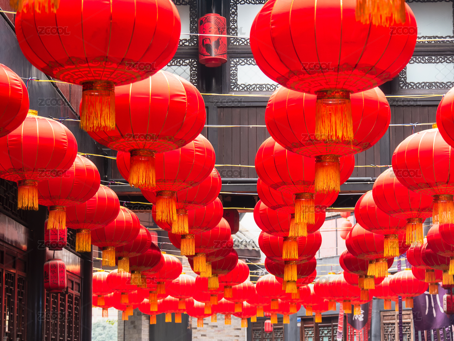 密集悬挂的喜庆中国红灯笼