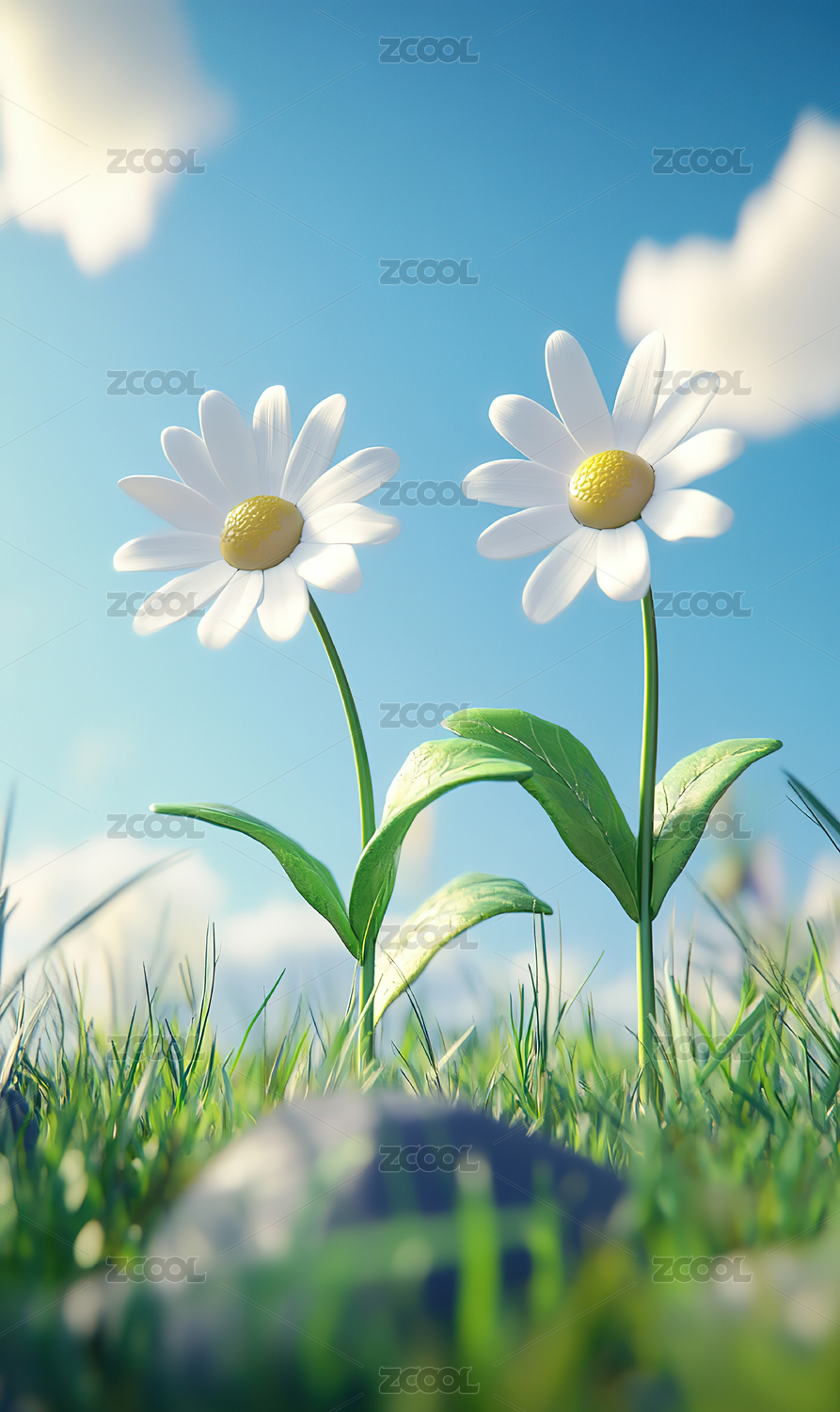 白底一丛盛开着鲜花和小草的3D卡通插画