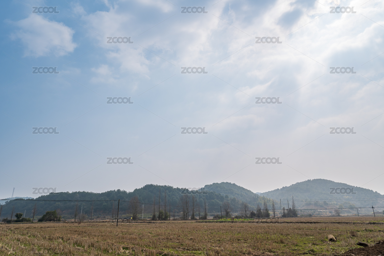 蓝天白云下已经收割完谷子留有稻桩的稻田