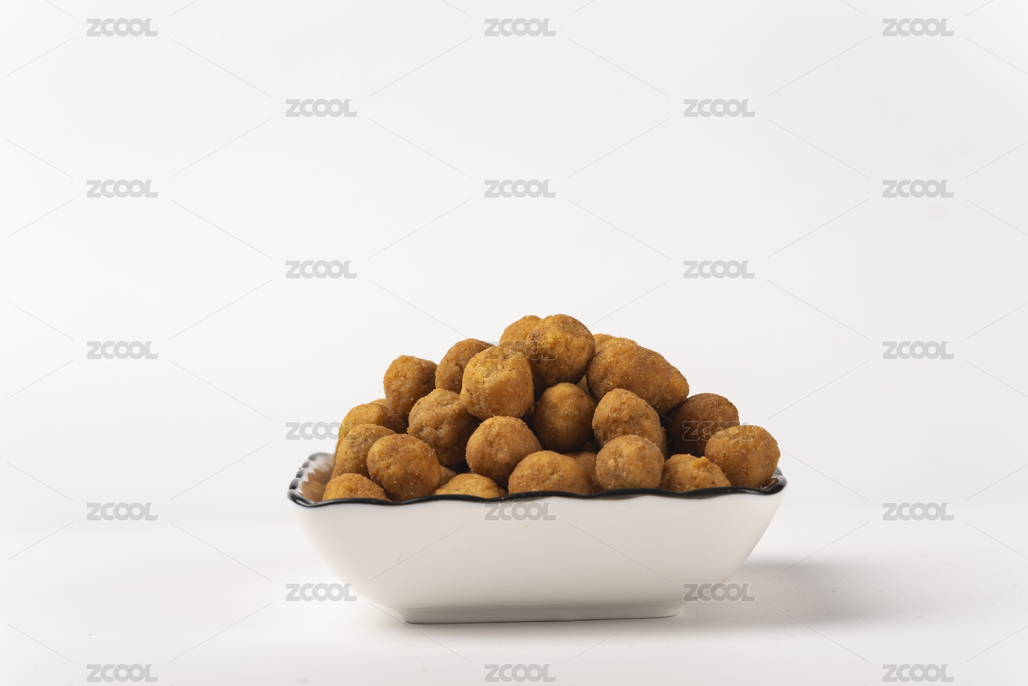 白背景上摆放的多味油炸花生仁