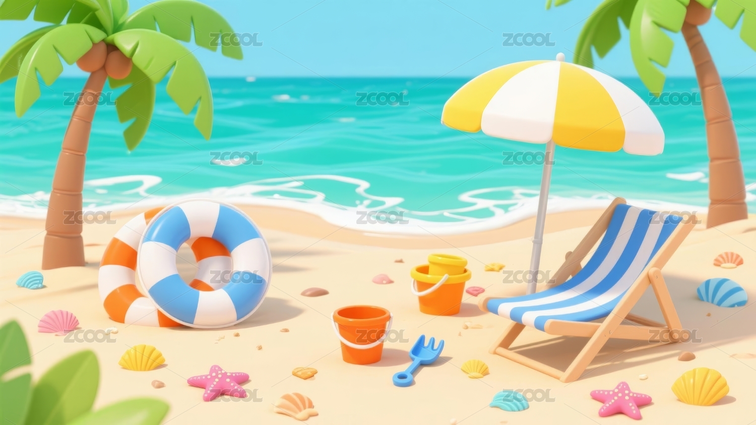 夏天海边沙滩度假旅游夏季海滩清新3D插画