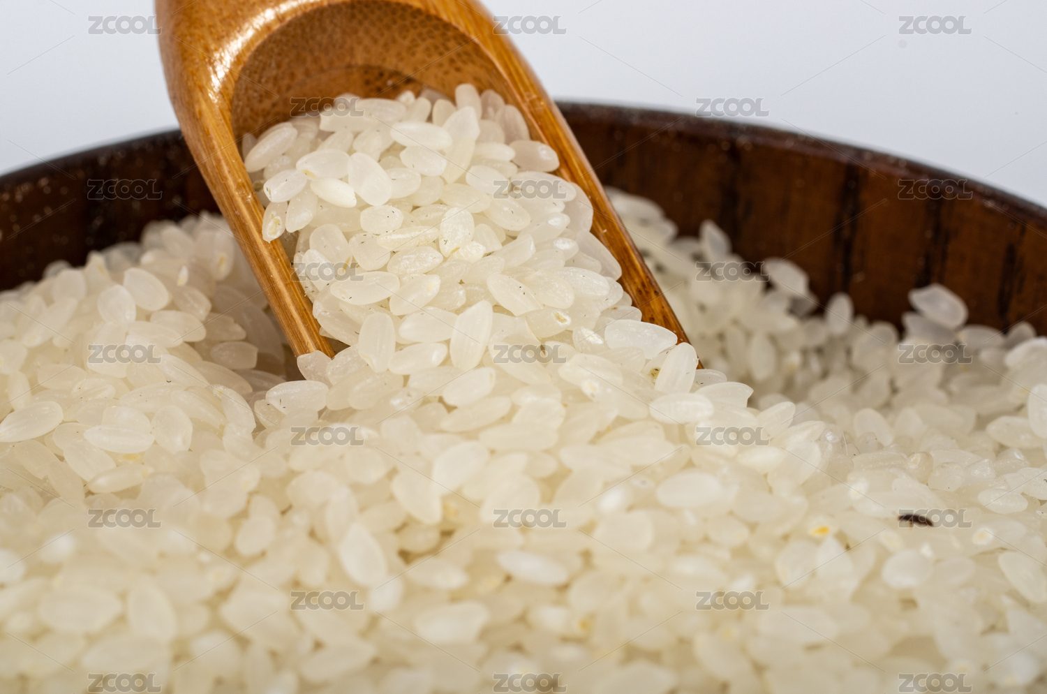 在白色背景上装在木盘里的大米特写