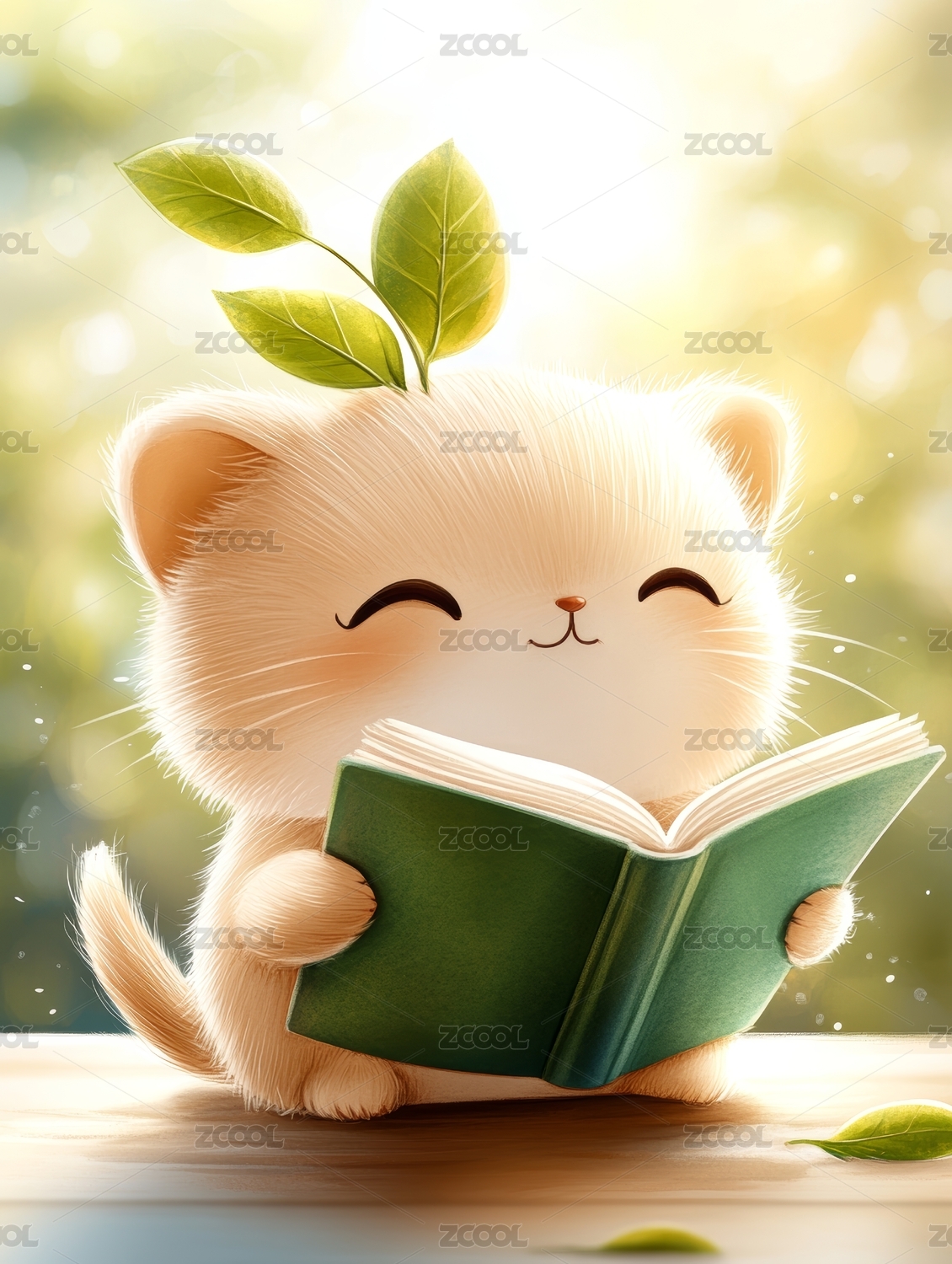 猫咪,书籍,花朵,插画,水彩,动物,植物,阅读,静物,可爱