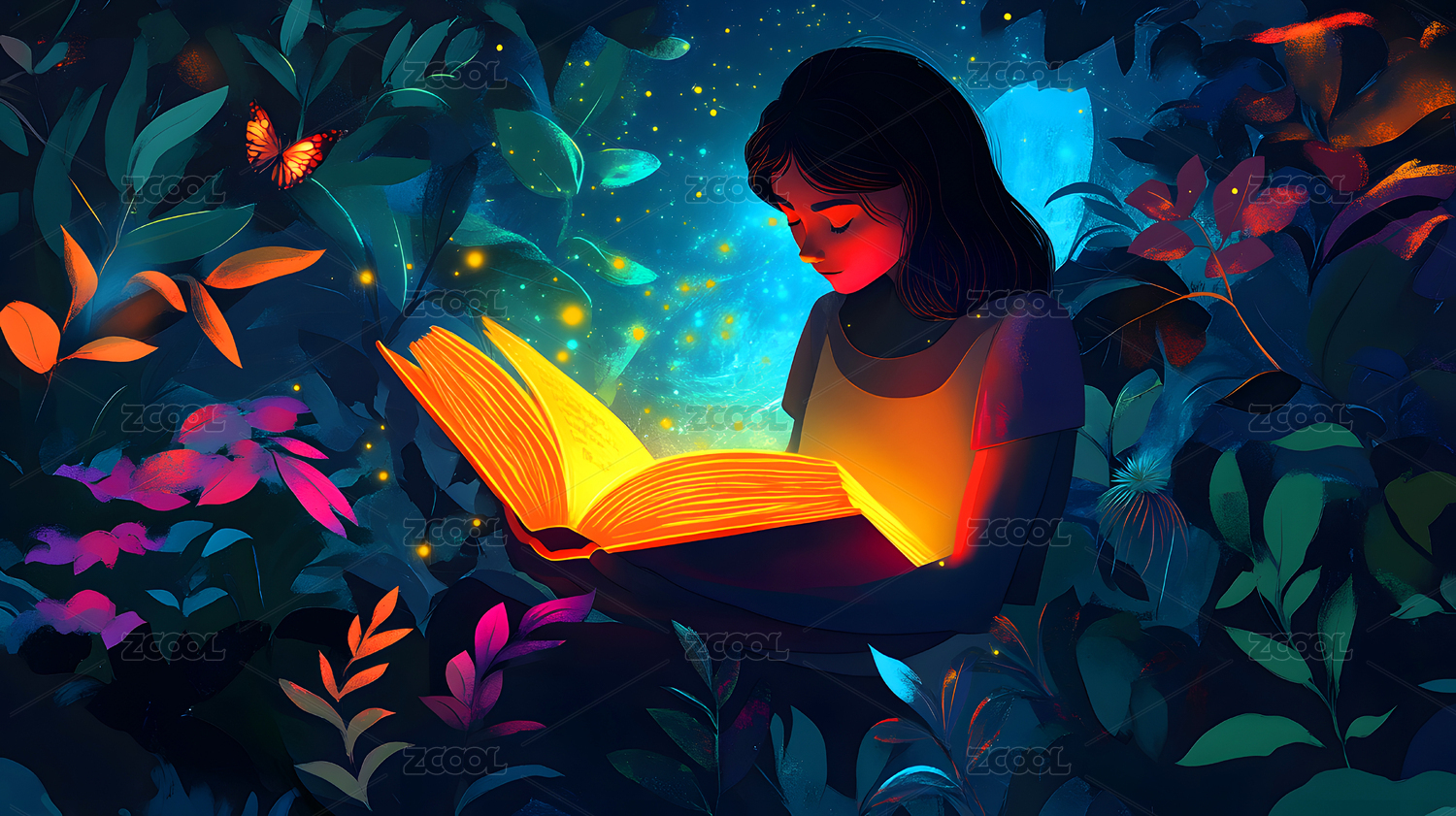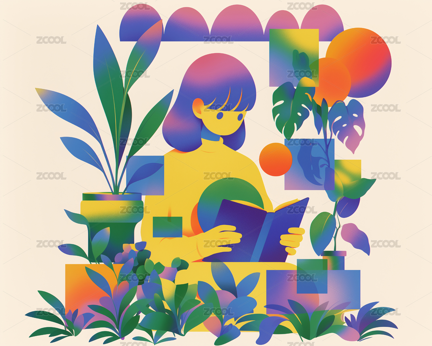 插画,炫彩,渐变,潮流,时尚,女性,抽象,流体,星球,看书