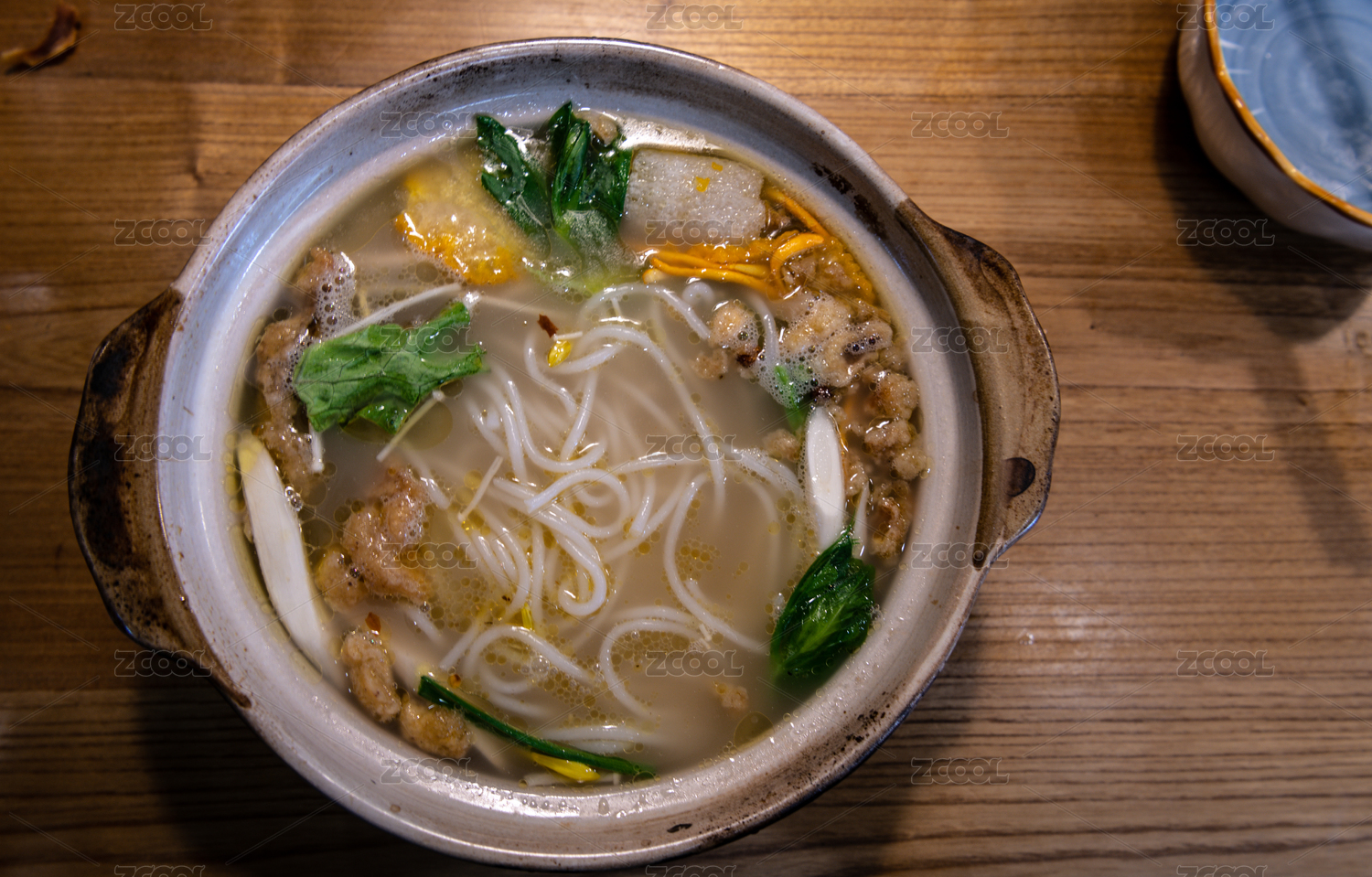 木桌上的瓷碗里的中国传统川菜美食冒菜鸭肠