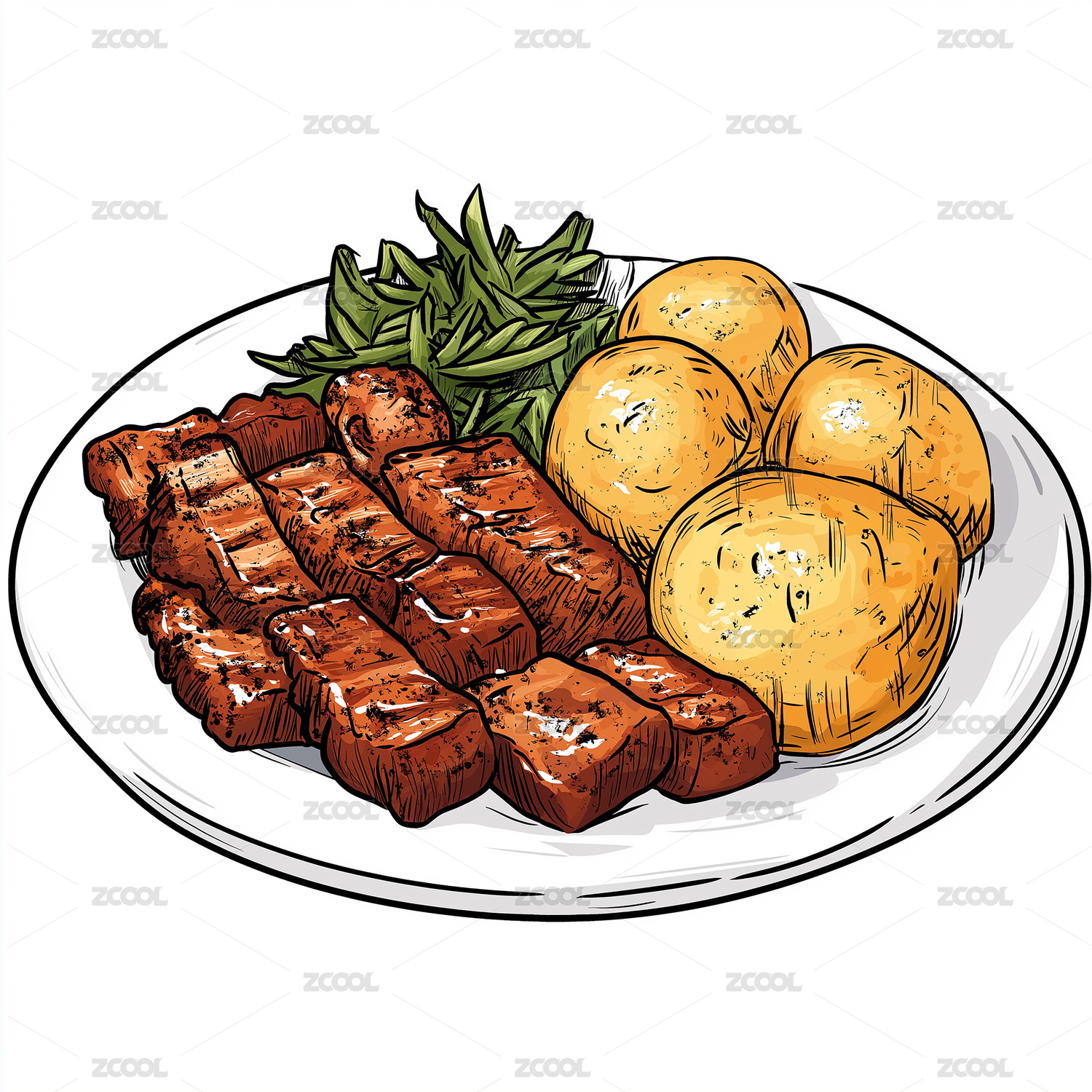 手绘煎牛肉蔬菜食物插画