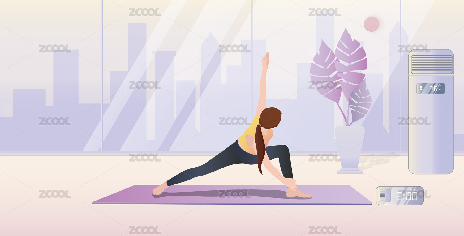美丽时尚的年轻单身女孩在健身房室内练瑜伽锻炼身体,一边开着智能空调感受科技带来的乐趣插画背景海报