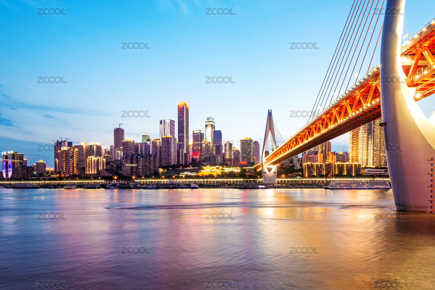 中国重庆市高楼和东水门大桥城市高视角夜景
