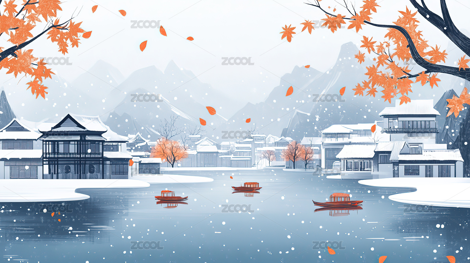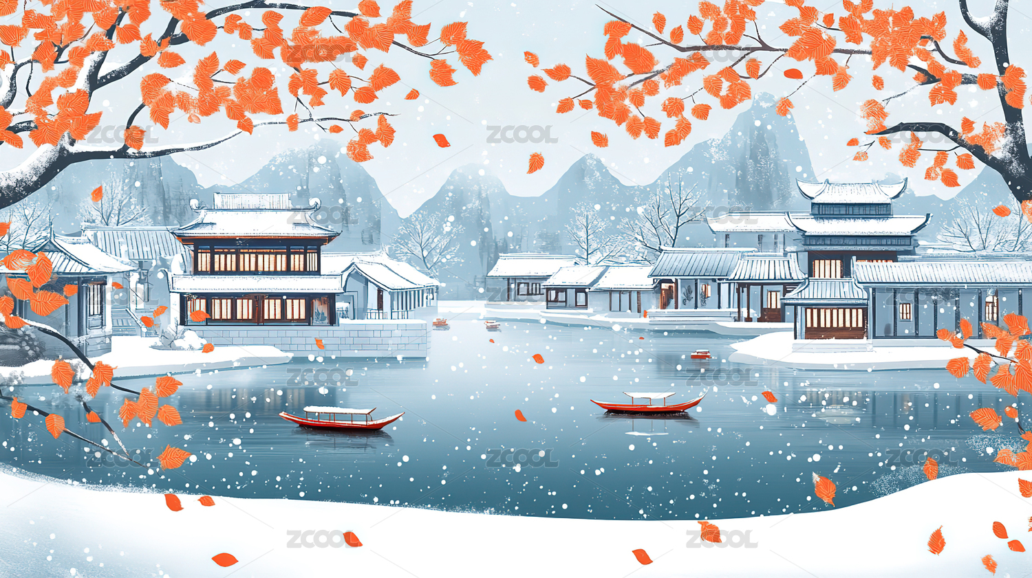 雪景红叶亭台山峦