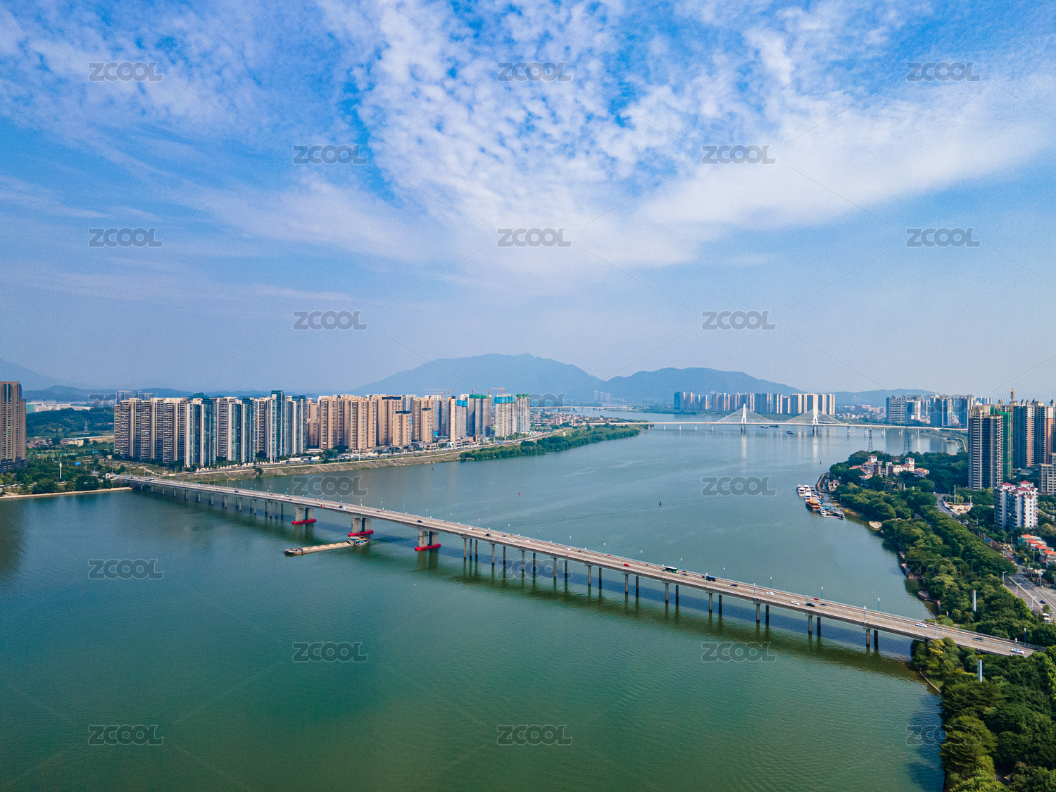 中国广东省清远市北江两岸建筑桥梁航拍景观