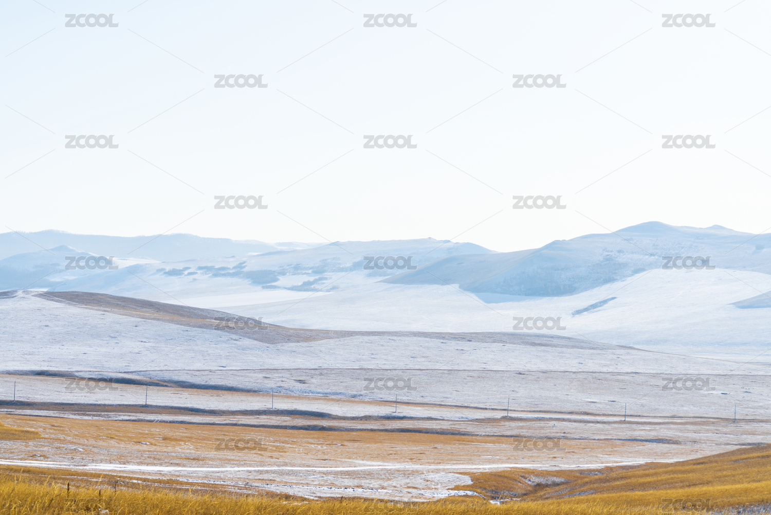 冬天雪后的中国呼伦贝尔黄色草原和山坡