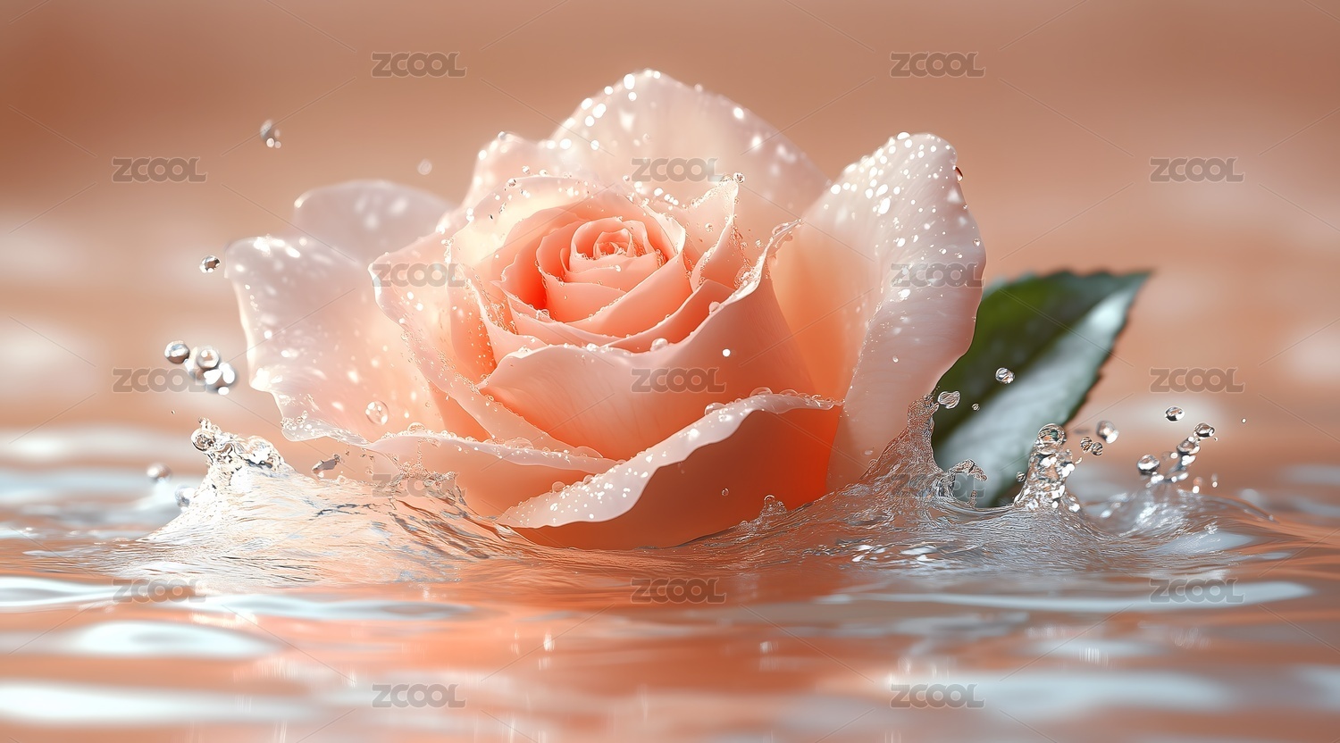 一朵粉红色的玫瑰花浮在水面上泛起波纹
