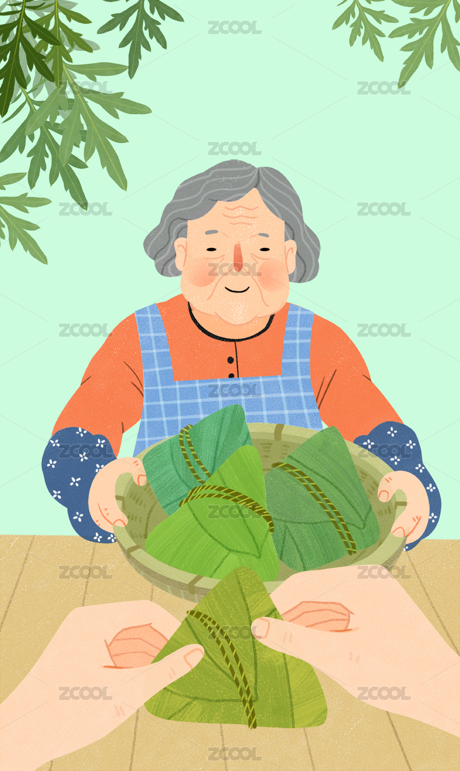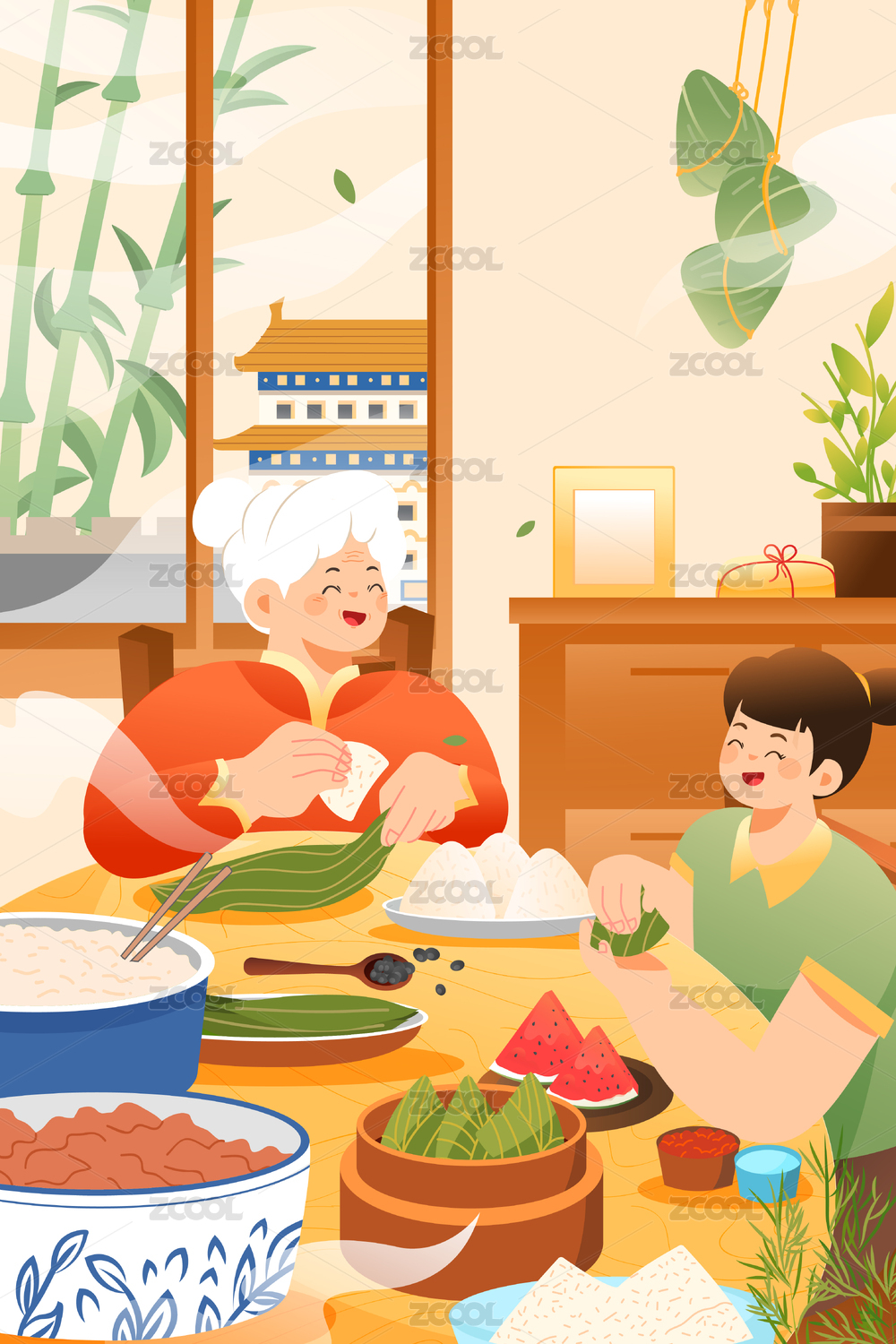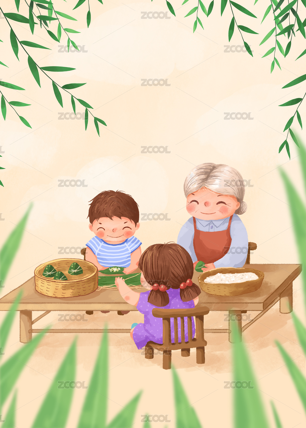 端午节传统节日插画无边:端午和爷爷奶奶一起包粽子