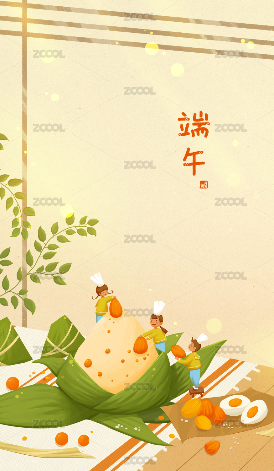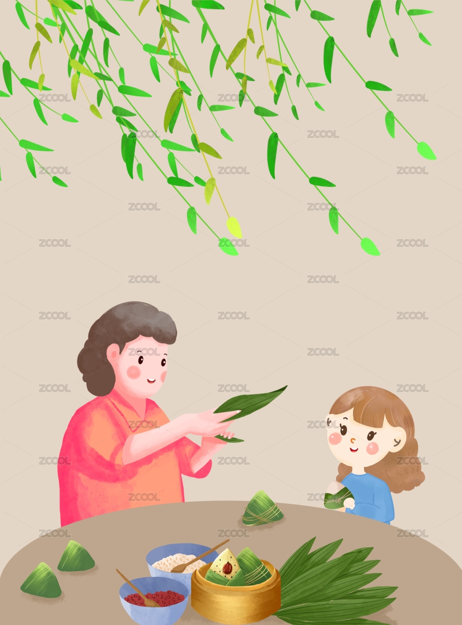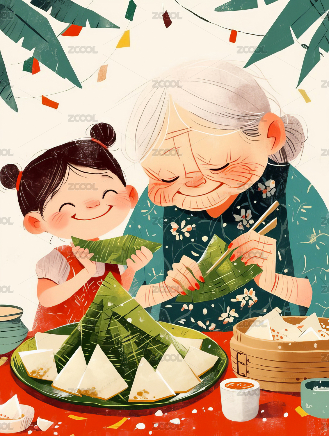 端午节传统节日插画无边:端午和爷爷奶奶一起包粽子