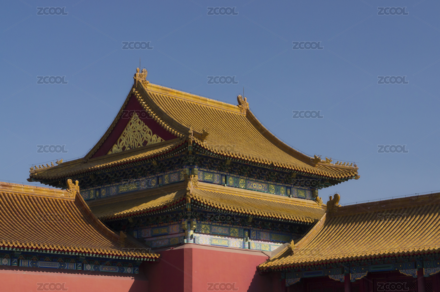 中国北京故宫博物院古建一角——琉璃瓦屋顶飞檐瑞兽