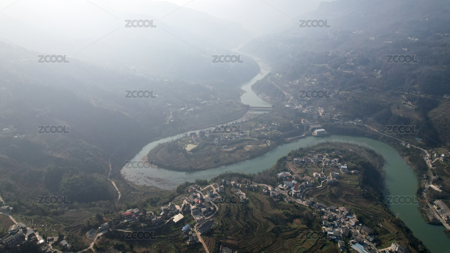 俯视阴雨天的湖南湘西乡村河流