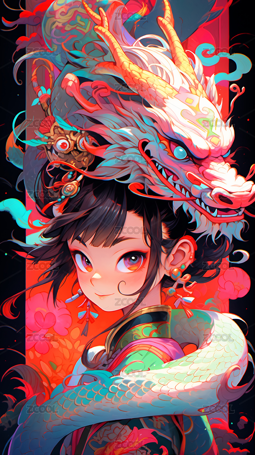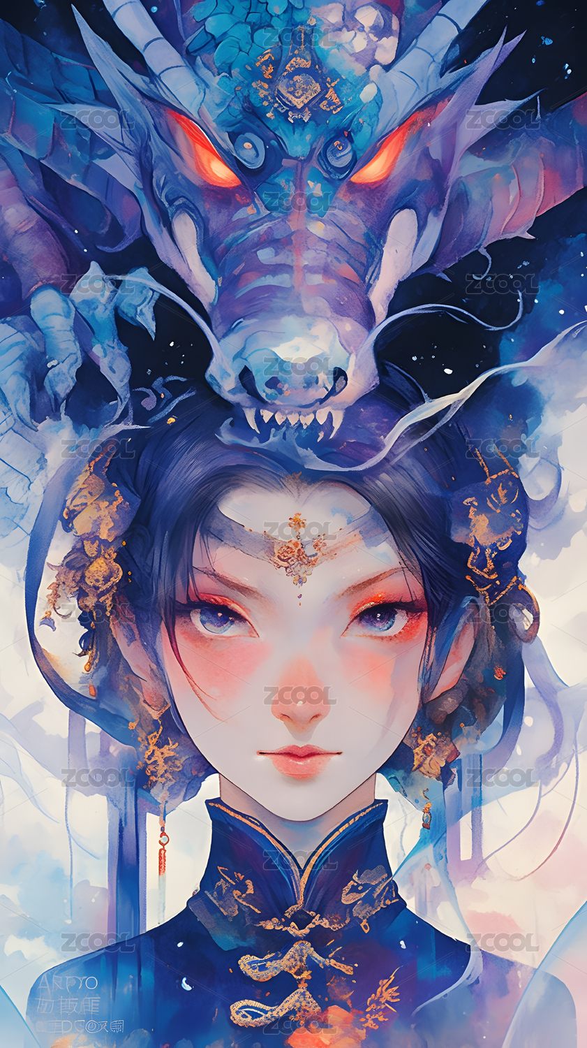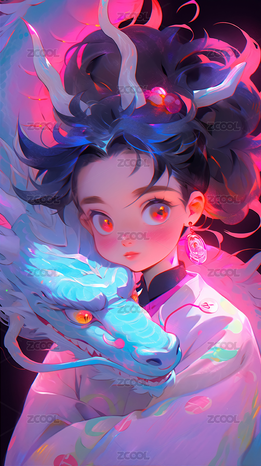 国潮奇幻唯美二次元女孩和龙插画