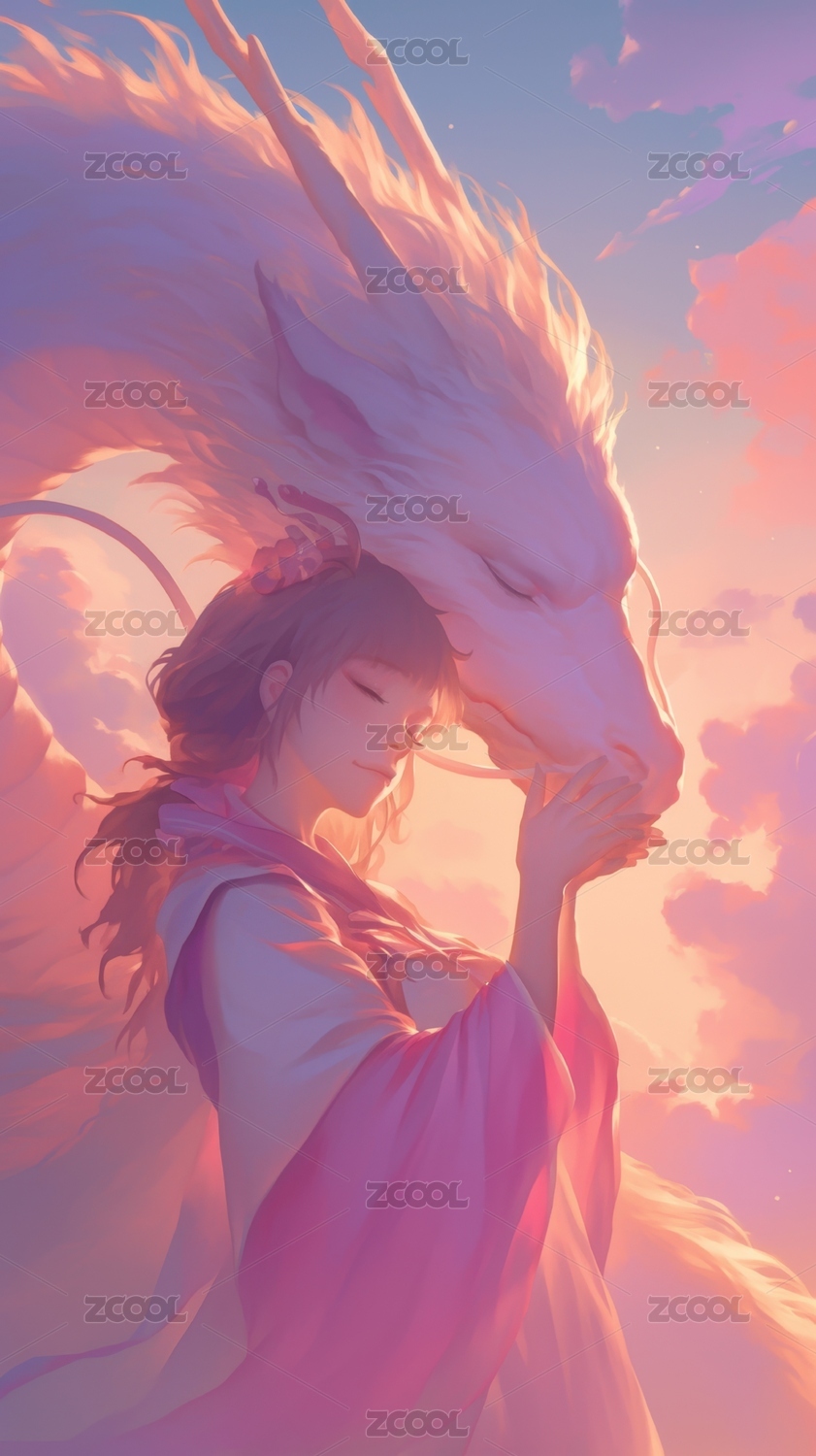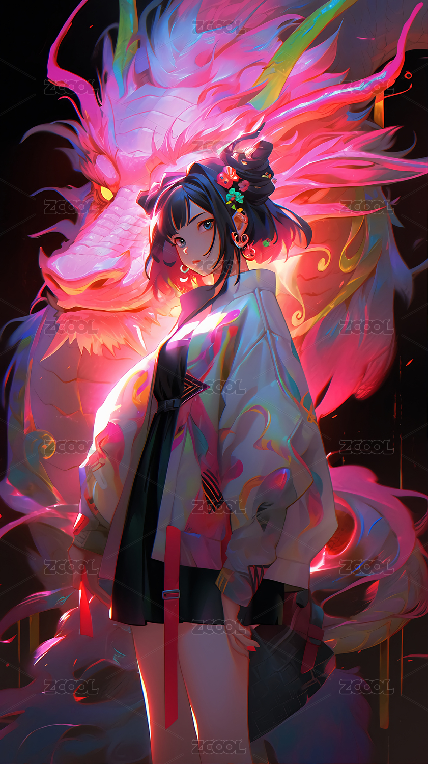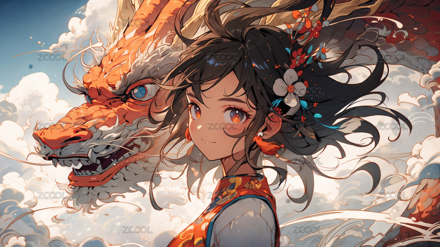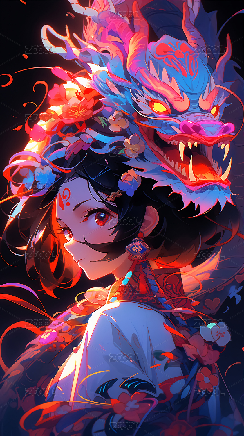 国潮奇幻唯美二次元女孩和龙插画