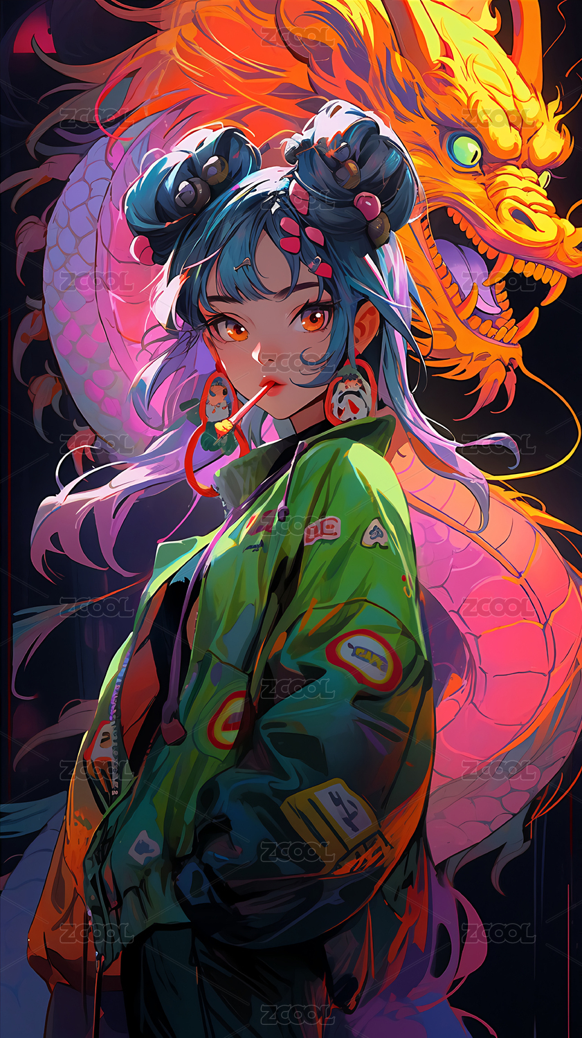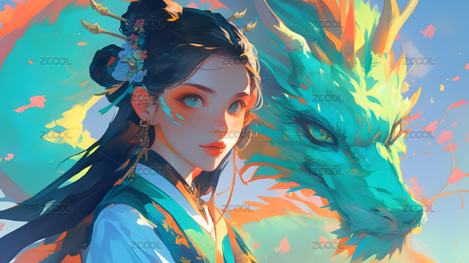 女孩与青色神龙奇幻色彩交织