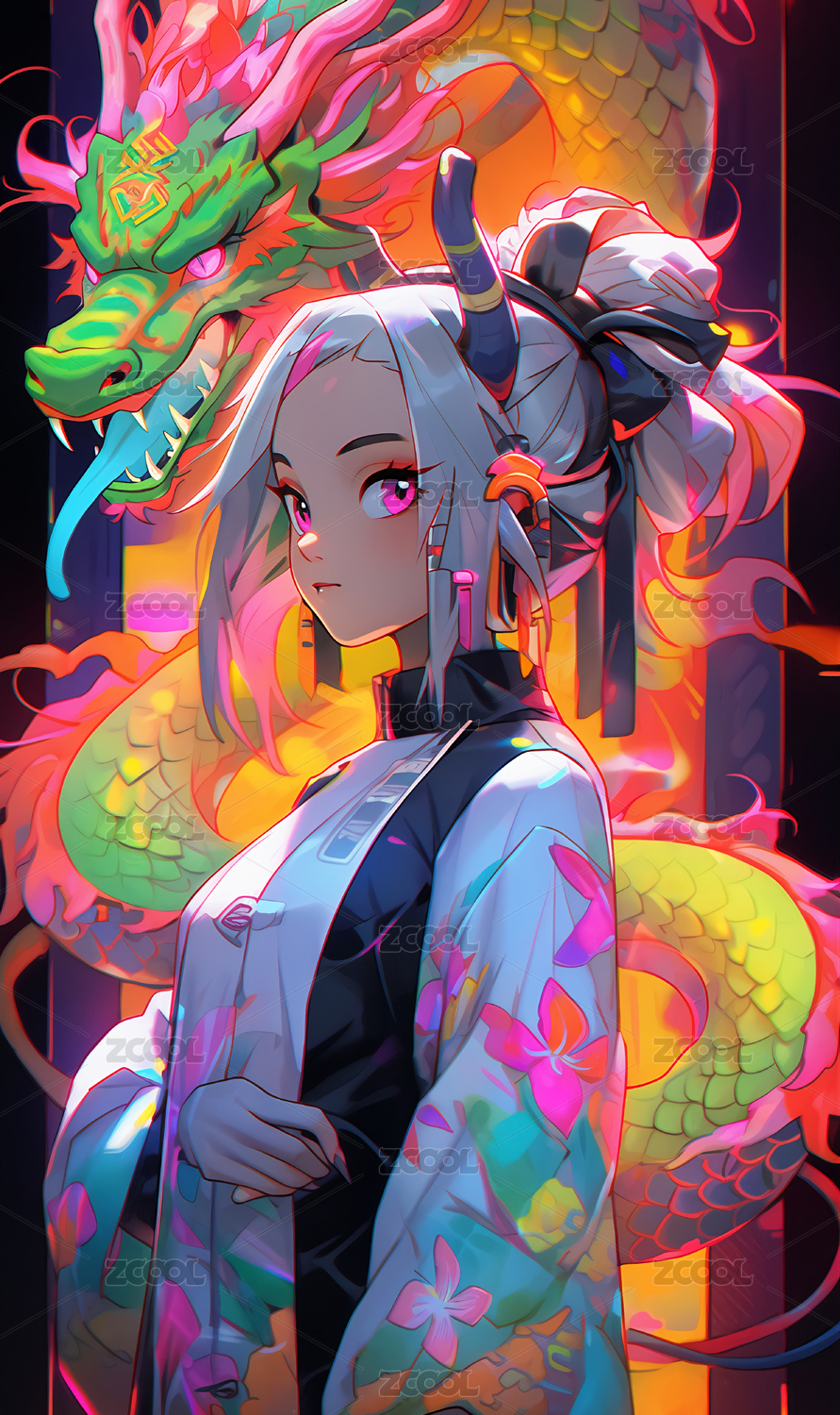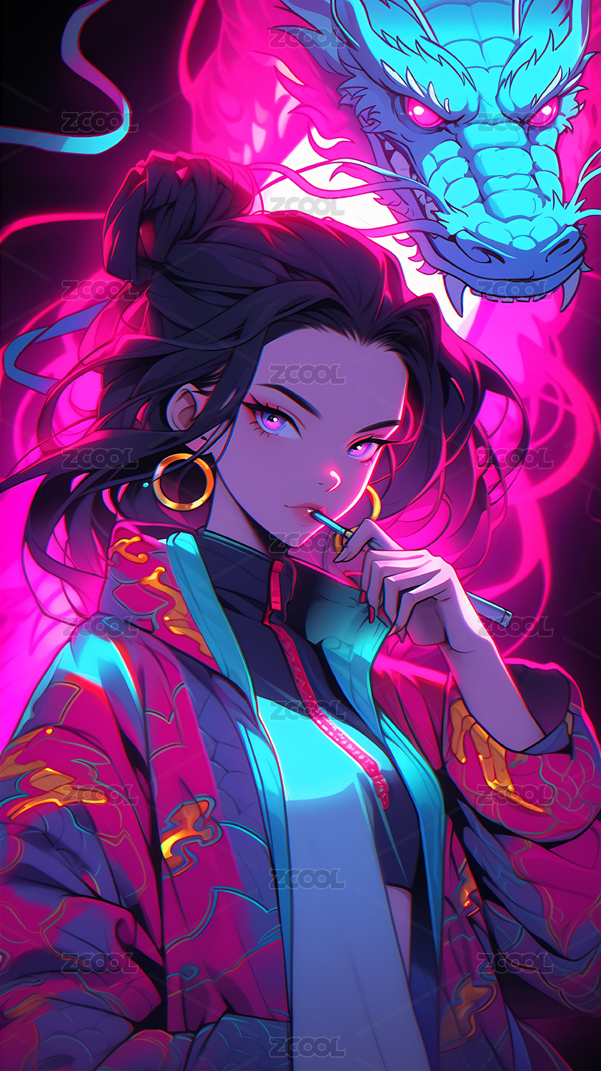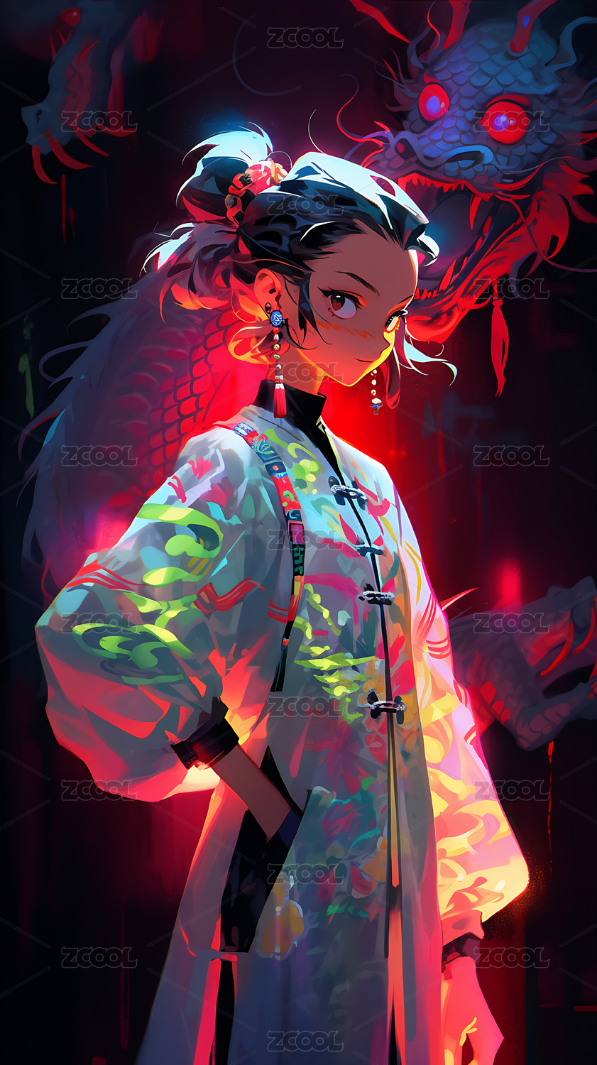 漂亮,女孩,国潮,龙,国风,汉服,人物,长发,赛博朋克,梦幻