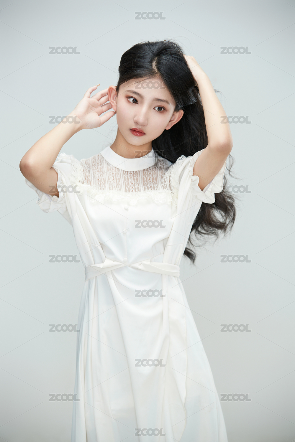 白色背景下身穿连衣裙的清纯少女