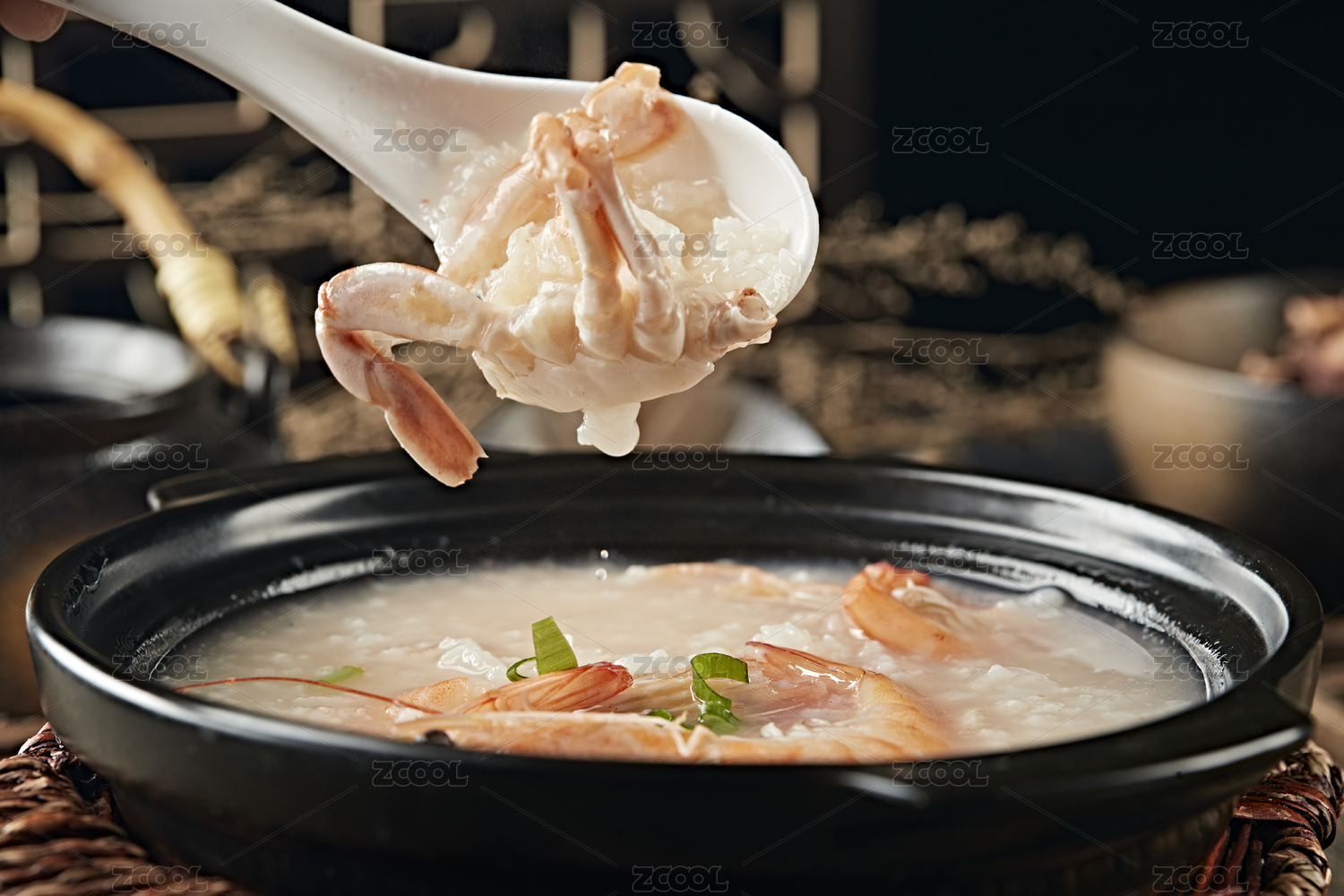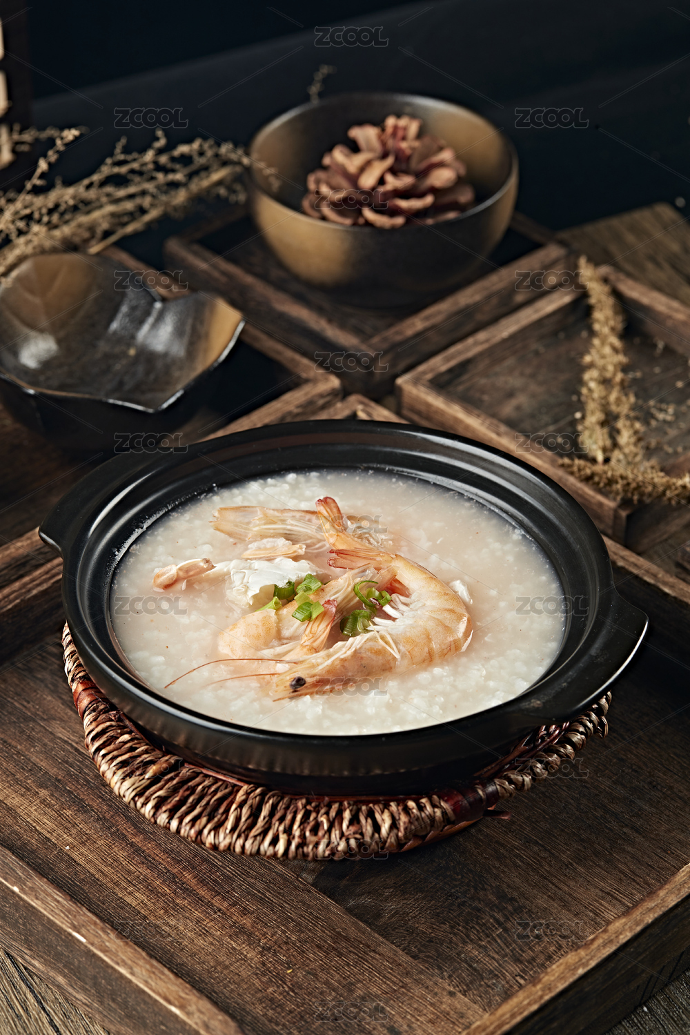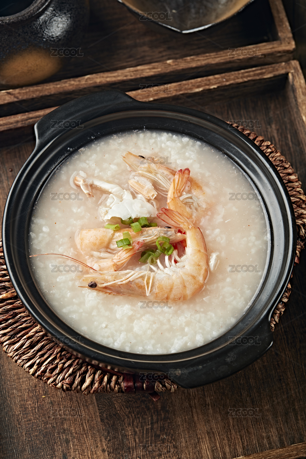 木桌上黑色砂锅里的海鲜粥虾粥稀饭