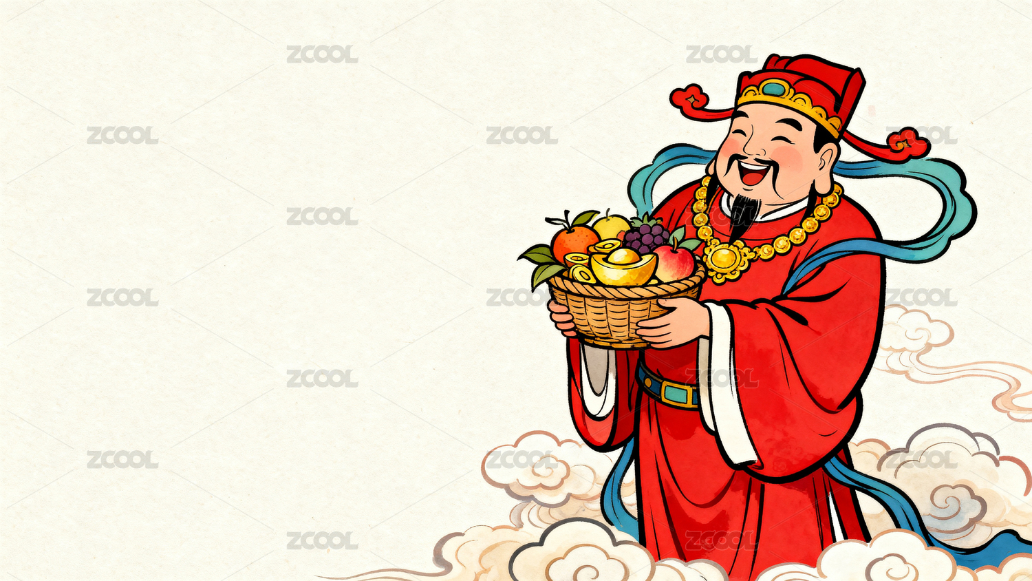 财神爷手捧果篮笑迎新春
