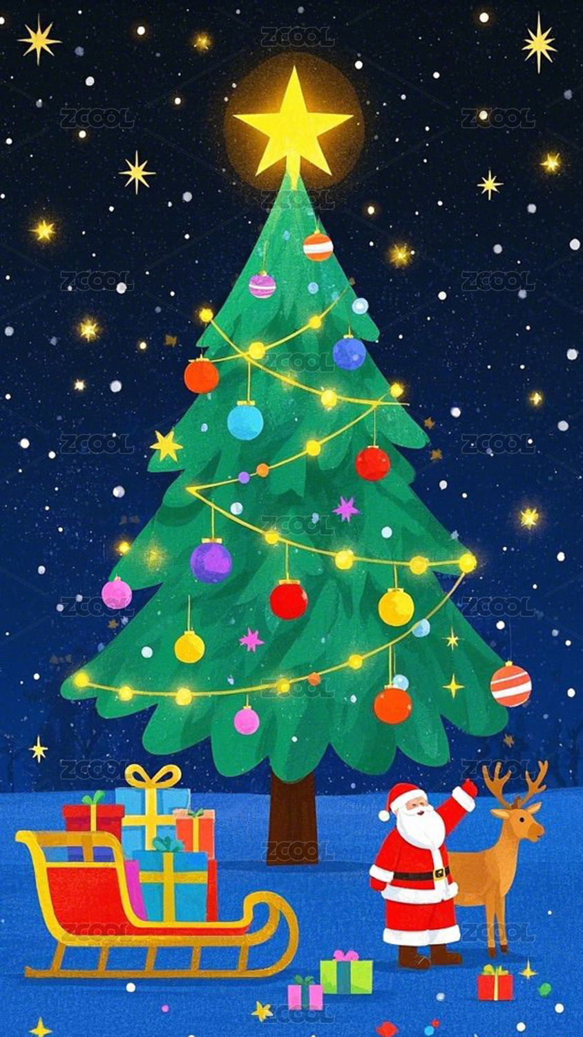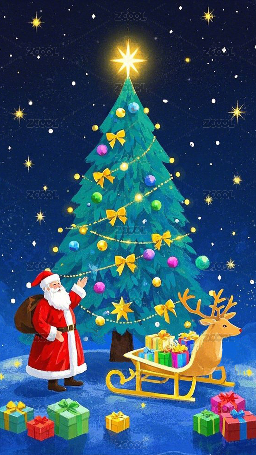 圣诞节圣诞老人骑着麋鹿圣诞树下送礼物