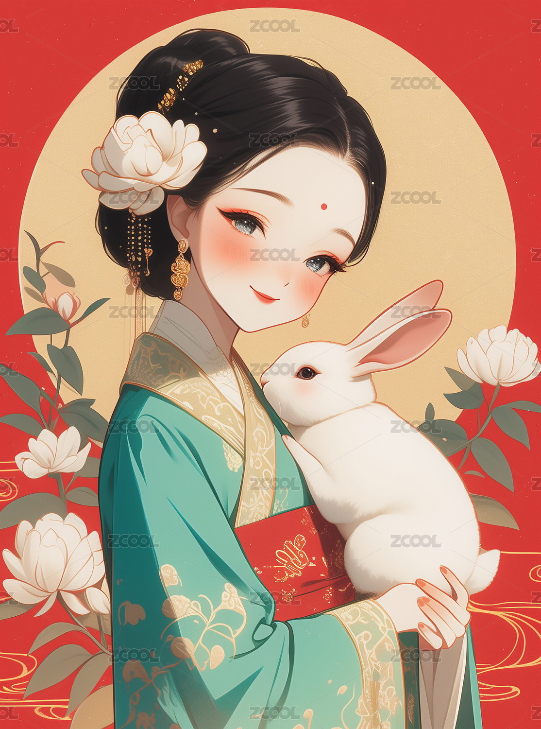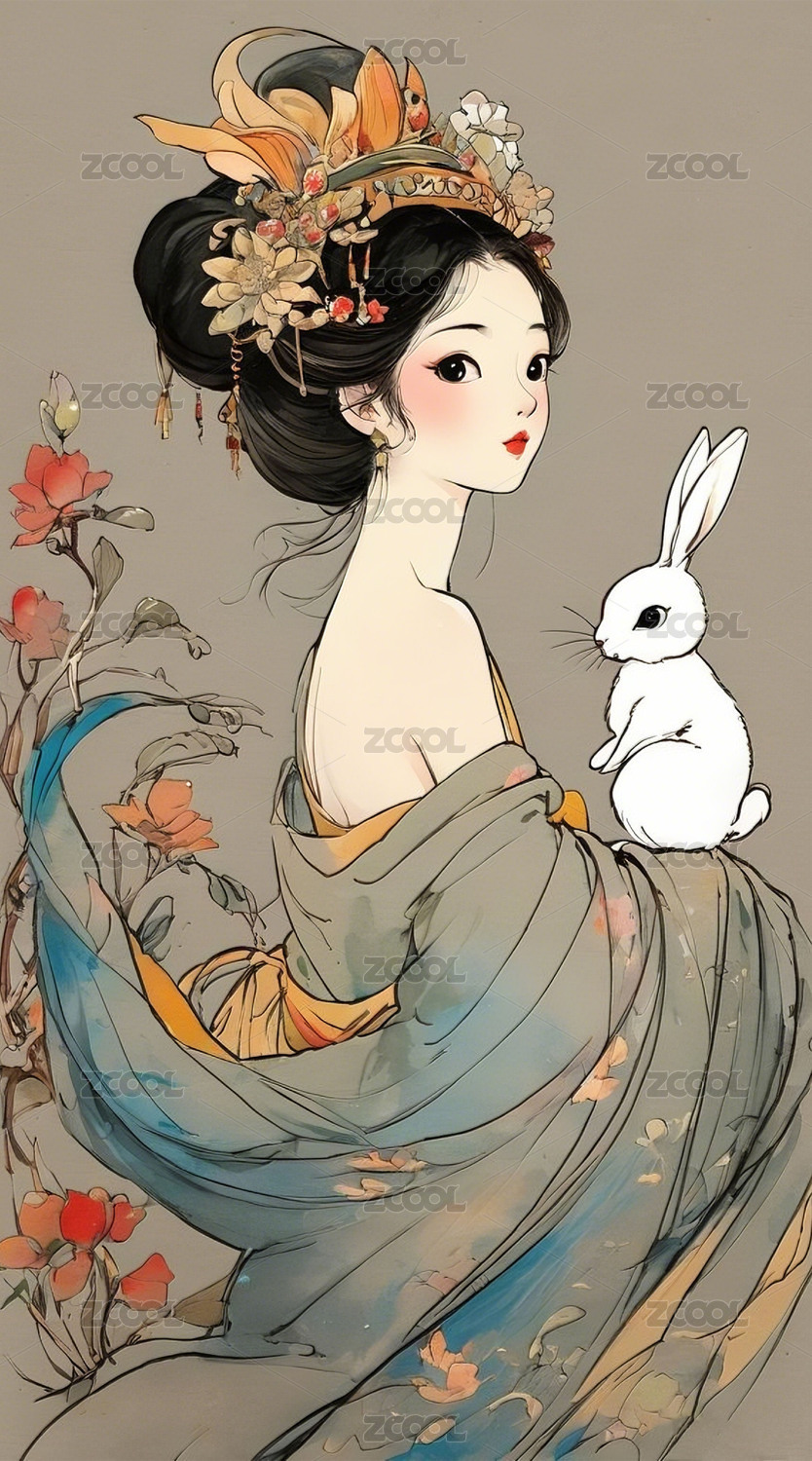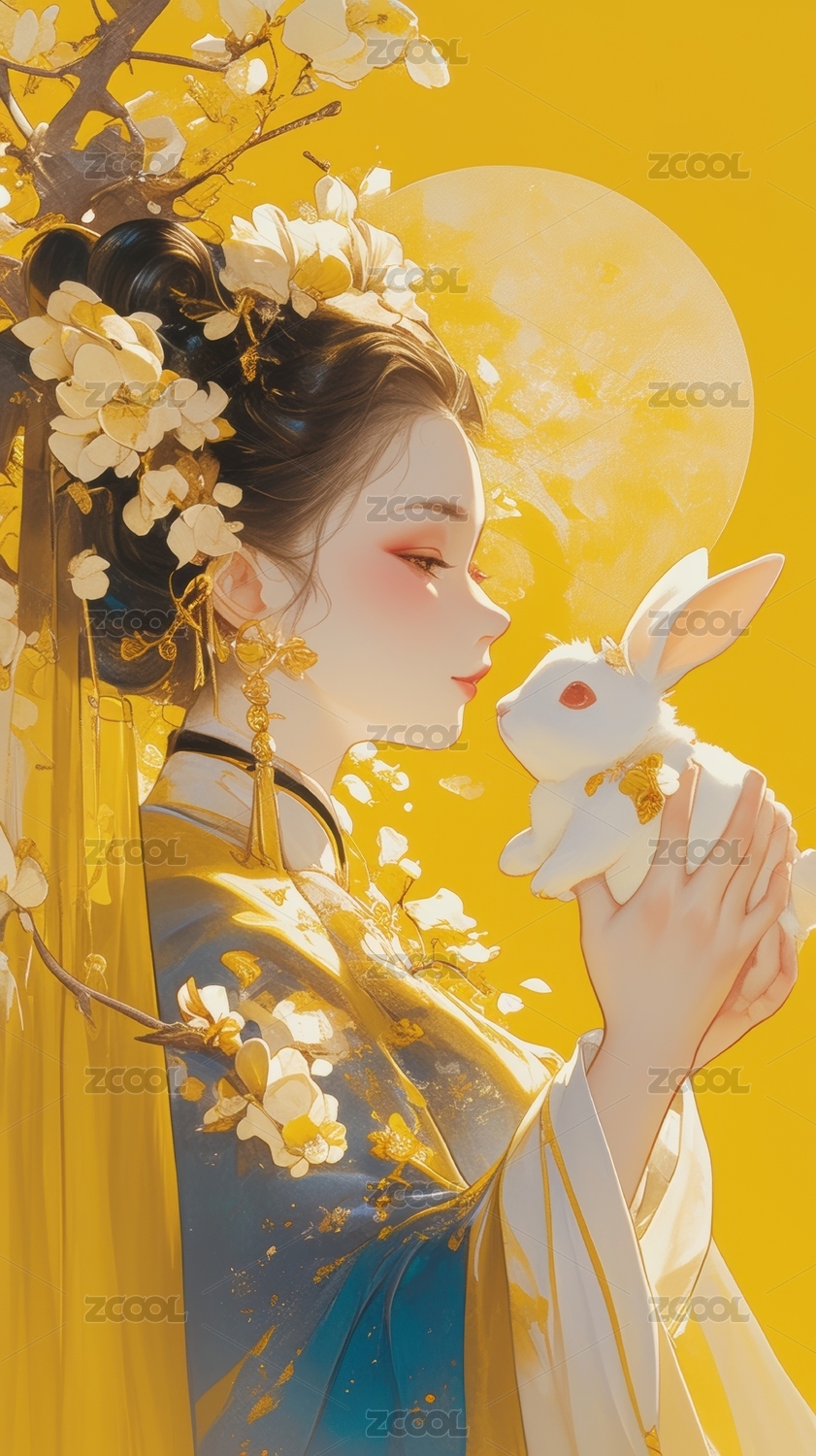 中秋节抱兔子的可爱女孩嫦娥仙子