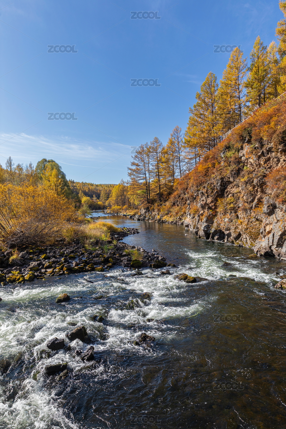 秋天内蒙古阿尔山森林里的河流和树木风景